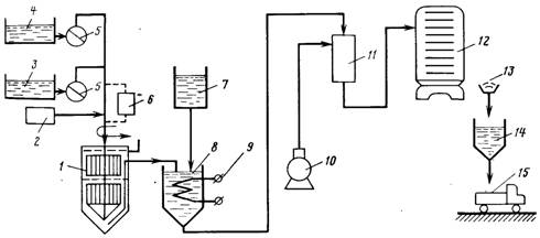 Рис 4. Технологическая схема обработки осадков на камерном фильт-прессе 1 — уплотнитель; 2 — дозатор ПАА; 3 — усреднитель-отстойник осадков из отстойников или осветлителей со взвешенным слоем осадка; 4 — Усреднитель-отстойник промывных вод фильтровальных сооружений; 5 — насос; 6 — сборник осадков; 7 — дозатор флокулянтов и вспомогательных веществ; 8 — промежуточная емкость; 9 — нагревательный элемент; 10 — компрессор; 11 — монжус; 12 —камерный фильтр-пресс; 13 — транспортер; 14 — бункер; 15 — автосамосвал Для механического обезвоживания требуется предварительная подготовка осадка, которая заключается в разрушении гелеобраз- ной структуры гидроксида алюминия. Хороший эффект дает применение извести. Использование фильтр-пресса считается экономичным для осадков вод средней цветности и мутности при дозах извести не более 50 . . . 70% от массы сухого осадка. Кислотная обработка осадка для регенерации сульфата алюминия (рис. 18.5) может также применяться на водоочистных комплексах различной производительности. Кислотную обработку нецелесообразно осуществлять на очистных комплексах, которые обрабатывают высокоцветную воду. В этом случае восстановленный коагулянт будет загрязнен растворенными органическими веществами. Не следует также применять кислотную обработку для осадков от очистки высокомутных вод. Осадок от обработки таких вод имеет низкое содержание остаточного гидроксида алюминия и большой абсолютный объем. Расход 100% кислоты в среднем составляет 3 кг на 1 кг оксида алюминия. Применение кислотной обработки имеет также ограничение и по химическим показателям исходной воды.