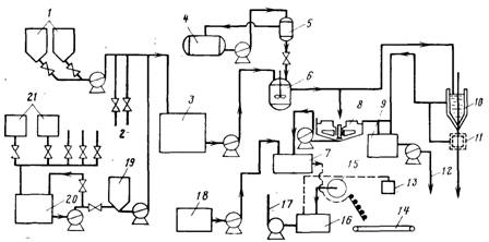 Рис. 5. Схема регенерации коагулянта кислотой 1 — сооружения предочистки; 2 — осадок от других сооружений; 3— усреднитель; 4 — бак кислоты; 5 — мерник; 6 — реактор; 7 — сборник уплотненного осадка; 8, 10 — отстойник; 9 — бак регенеративного раствора коагулянта; 11 — морозильная камера; 12 — отвод регенерированного раствора коагулянта; 13 — вакуум-насос; 14 — транспортер для кэка; 15 — вакуум-фильтр; 16 — сборник фильтрата; 17 — возврат фильтрата в начало технологического тракта; 18 — блок приготовления известкового молока; 19 промежуточная емкость; 20 — сборник промывных вод фильтров; 21 — скорые фильтры Растворенные кислотой токсические загрязнения из осадка будут переходить в обрабатываемую воду и накапливаться в ней. Восстановление сульфата алюминия происходит в три этапа: уплотнение осадка до концентрации сульфата алюминия не менее 2% (20 г/л); добавление серной кислоты до кислотности при рН 2...3 и пребывание в растворе для увеличения уплотнения; отделение осадка от сульфата алюминия. Восстановление сульфата алюминия до 90% возможно в том случае, если фльтр-прессы способны выдержать сильно кислые осадки. Для облегчения транспортировки и хранения в конце цикла на фильтр-прессы подается известковое молоко. Хороший эффект дают добавки искусственных органических и неорганических флокулянтов. Считают, что осадок таким способом можно обезводить до концентрации сухого вещества 40... 45%. После самых эффективных в настоящее время способов обезвоживания остается проблема осадков, так как их влажность в лучшем случае практически составляет 50%. По мнению В. М. Любарского, лучшим способом остается размещение осадка по территории при соблюдении следующих условий: вода, проникающая в кек, должна испаряться; после дождя кек не должен превращаться в суспензию; безвредность веществ» содержащихся в осадке для окружающей среды. ЛИТЕРАТУРА Алексеев Л. С., Гладков В. А. Улучшение качества мягких вод. М., Стройиздат, 1994 г. Алферова Л. А., Нечаев А. П. Замкнутые системы водного хозяйства промышленных предприятий, комплексов и районов. М., 1984. Аюкаев Р. И., Мельцер В. 3. Производство и применение фильтрующих материалов для очистки воды. Л., 1985. Вейцер Ю. М., Мииц Д. М. Высокомолекулярные флокулянты в процессах очистки воды. М., 1984. Егоров А. И. Гидравлика напорных трубчатых систем в водопроводных очистных сооружениях. М., 1984. Журба М. Г. Очистки воды на зернистых фильтрах. Львов, 1980. |