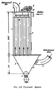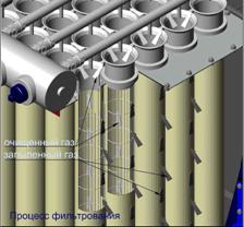 Общий вид рукавного фильтра Каждый вид ФРСО имеет пять типоразмеров длины рукавов- 1200,2400,3500,4700 и 5800мм. Диаметр рукавов единообразен для любой модификации фильтра. Выбор фильтра осуществляется в зависимости от расхода очищаемого газа, его температуры, физических и химических свойств, влажности, режима работы и др. Регенерация рукавных фильтров В процессе работы матерчатых фильтров происходит постепенное отложение пыли в порах фильтровального материала и на его поверхности. По мере роста слоя пыли растет и гидравлическое сопротивление аппарата. Если периодически не удалять пылевой слой с поверхности материала произойдет «запирание фильтра», т.е. тягодутьевой аппарат (обычно вентилятор) будет не в состоянии протягивать газ через забившуюся фильтровальную перегородку. В результате постепенного забивания, будет падать эффективность фильтра и, в конце концов, движение газа через фильтр прекратится. Для поддержания фильтра в работоспособном состоянии необходимо периодически удалять пыль с поверхности фильтровального материала из пор. Однако, как известно, оседающий на поверхности фильтровального материала слой пыли одновременно является фильтрующей средой, препятствующей проскоку наиболее мелких частиц пыли. Поэтому с фильтровального материала необходимо удалить не весь слой пыли, а только часть, чтобы обеспечить приемлемое гидравлическое сопротивление аппарата и сохранить его высокую эффективность пылеулавливания. Процесс удаления части пылевого слоя снаружи и изнутри фильтровальной перегородки в матерчатых фильтрах принято называть регенерацией, т.е. частичным восстановлением первоначальных свойств фильтровальной перегородки. В промышленной эксплуатации в настоящее время находится много конструкций, систем, устройств для регенерации фильтровального материала. пылегазоочистной рукавный фильтр регенерация Классификация рукавных фильтров по способу регенерации фильтровального материала: Механическое встряхивание Механическое встряхивание это основной способы регенерации фильтровального материала. Он основан на сотрясении рукавов в вертикальном и или горизонтальном направлении. Достоинствами фильтров с механическим отряхиванием является стабильность удаления осадка пыли. В качестве основных недостатков следует отметить сложность встряхивающего механизма, который требует постоянного внимания обслуживающего персонала, истирание и изломы рукавов в одних и тех же местах, чувствительность системы к усадке и вытяжке рукавов, необходимость отключения фильтра или отдельной секции на время проведения регенерации. Обратная продувка Эффективный метод регенерации фильтровального материала путем обратной продувки очищенным газом или напорным воздухом. Обратная продувка, как правило, применяется в сочетании с другими способами: механическим встряхиванием, перекручиванием, вибрацией, покачиванием рукавов и др. Такие фильтры(фильтры ФРО) довольно эффективны, удобны в эксплуатации и обслуживании. Однако производительность их несколько снижена за счет подсоса воздуха в период регенерации фильтровального материала. Обратная продувка обычно сопровождается плавной деформацией фильтровального материала, которая не действует так отрицательно на волокна как, например, механическое отряхивание. 
