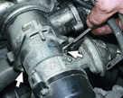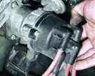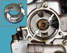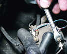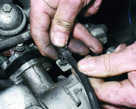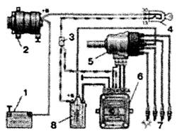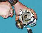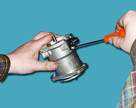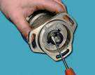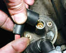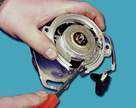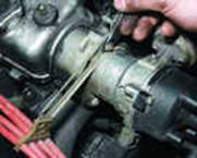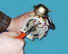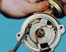 Включаем двигатель и, постепенно увеличиваем вращение коленчатого вала, cледим за показаниями вольтметра. После запуска двигателя он должен показывать не менее 10 В (клапан открыт), а при вращения коленчатого вала около 20 В напряжение должно резко снизиться у величины не более 0,5 В (клапан закрыться). После этого медленно обороты двигателя, при частоте вращения коленчатого вала около 10 напряжение должно скачкообразно увеличиться до прежней величины; клапан должен открыться). Устанавливаем обороты в пределах 2200-2300 мин клапан закрыт) и отсоединяем от "массы" провод концевого выключателя карбюратора, после чего клапан должен открыться. 2.5 Снятие и установка распределителя зажигания