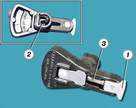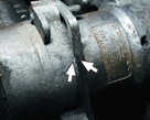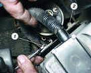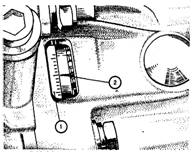 Рис.5. Метки для установки момента зажигания: 1 - шкала; 2 - метка на маховике Проверить и установить момент зажигания можно с помощью стробоскопа, действуя в следующем порядке: соедините зажим "плюс" стробоскопа с клеммой "плюс" аккумулятора, зажим "массы" - с клеммой "минус" аккумулятора, а зажим датчика стробоскопа присоедините к проводу высокого напряжения 1-го цилиндра; запустите двигатель и направьте мигающий поток света стробоскопа в люк картера сцепления. Для регулировки момента зажигания остановите двигатель, ослабьте гайки крепления датчика-распределителя зажигания и поверните его на необходимый угол. Для увеличения угла опережения зажигания корпус датчика-распределителя следует довернуть по часовой стрелке, а для уменьшения - против часовой стрелки (если смотреть со стороны крышки датчика-распределителя зажигания). Затяните гайки крепления и снова проверьте установку момента зажигания.