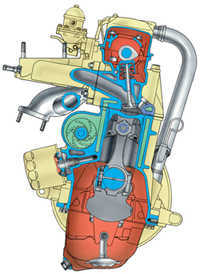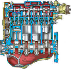 Рис.2. Продольный разрез двигателя мод.2110 Рис.3. Поперечный разрез двигателя мод.2110 Сверху на блок цилиндров установлена головка блока, отлитая из алюминиевого сплава. В нижней части головки отлиты каналы, по которым циркулирует жидкость, охлаждающая камеры сгорания. В верхней части головки установлен распределительный вал (у двигателей мод.2112 - два распределительных вала: один для впускных клапанов, второй - для выпускных). У двигателей мод.2110 и 2111 распределительный вал вращается в опорах, в верхней части головки блока и двух корпусах подшипников, закрепленных гайками на шпильках, ввернутых в головку блока. У двигателя мод.2112 распределительные валы установлены в опорах, выполненных в верхней части головки блока, и одном общем корпусе подшипников, закрепленном болтами на головке блока. Распределительные валы отлиты из чугуна. Для уменьшения износа рабочие поверхности кулачков, поверхности под сальник и эксцентрика привода топливного насоса термообрабатываются - отбеливаются. Кулачки распределительных валов через толкатели приводят в действие клапаны. У двигателей 2110 и 2111 в верхней части толкателей установлены стальные регулировочные шайбы, подбором этих шайб регулируют зазоры в приводе клапанов. У двигателя мод.2112 установлены гидротолкатели клапанов, которые автоматически компенсируют зазоры в приводе клапанов. Поэтому у этих двигателей в процессе эксплуатации не нужно регулировать зазоры. Двигатели мод.2110 и 2111 имеют по два клапана на цилиндр: один впускной и один выпускной, у двигателя мод.2112 четыре клапана - два впускных и два выпускных. Направляющие втулки и седла клапанов запрессованы в головку блока. Направляющие втулки, кроме того, имеют стопорные кольца, удерживающие их от выпадания. На направляющих втулках установлены маслосъемные колпачки, уменьшающие попадание масла в цилиндры. У двигателей мод.2110 и 2111 на каждом клапане установлены две пружины, у двигателя мод.2112 - одна. Распределительные валы приводятся в действие резиновым зубчатым ремнем от коленчатого вала. Система смазки комбинированная: разбрызгиванием и под давлением. Под давлением смазываются коренные и шатунные подшипники и опоры распределительных валов. Система состоит из масляного картера, шестеренчатого масляного насоса с маслоприемником, полнопоточного масляного фильтра, датчика давления масла и масляных клапанов. Система охлаждения двигателя состоит из рубашки охлаждения, радиатора с электровентилятором, центробежного водяного насоса, термостата и шлангов. Система питания состоит из воздушного фильтра, топливного бака, топливного насоса, топливопроводов и карбюратора у двигателя мод.2110 или топливной рампы с форсунками и регулятором давления топлива у двигателей мод.2111 и 2112. Кроме того, в систему питания двигателей мод.2111 и 2112 входят датчики, топливный фильтр и дроссельный патрубок. Топливный насос двигателя 2110 установлен на головке блока и приводится в действие от эксцентрика на распределительном валу через толкатель. У двигателей мод.2111 и 2112 топливный насос электрический, погружного типа, установлен в топливном баке и объединен с датчиком указателя уровня топлива. Система зажигания двигателя мод.2110 бесконтактная с распределителем зажигания, установленным на головке блока и приводимым в действие и приводимым в действие от рас