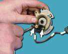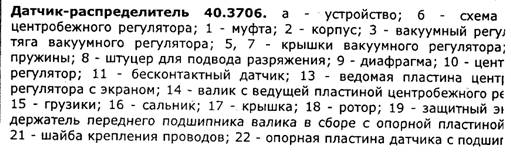 Точную проверку и настройку вакуумного и центробежного опережения зажигания производят на специальных стендах. В домашних условиях это делать не рекомендуется. При выходе из строя вакуумного регулятора следует заменить, при неисправности центробежного - заменив распределитель. Коммутатор типа 3620.3734 или 76.3734 размыкает цепь первичной обмотки катушки зажигания, преобразуя управляющие датчика в импульсы тока в катушке зажигания. Коммутатор проверяется осциллографом по специальной методике, он не ремонтопригоден, если отсоединять разъем коммутатора при включенном зажигании - это может вызвать его повреждение (как и других компонентов системы зажигания). Катушка зажигания - типа 3122.3705 - сухая, с замкнутым магнитопроводом типа 8352.12 - маслонаполненная, с разомкнутым магнитопроводом. Для проверки: сопротивление первичной обмотки при 25°С - 0,43±0,04 Ом, вторичной обмотки - 4,08±0,4 кОм (3122.5±1 кОм (8352.12). Сопротивление изоляции на массу - не менее 50 МОм.