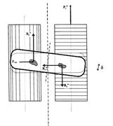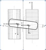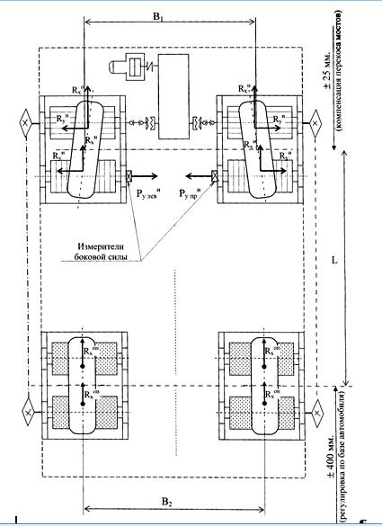 где Кув - коэффициент сопротивления уводу. Естественно предположить, что если на колесо извне боковая сила не действует, а колесо установлено таким образом, что его направление перемещения образует с плоскостью вращения определенный угол de,a (колесо установлено со схождением и развалом), то в пятне контакта колеса с опорной поверхностью появится боковая сила Р¶¢у, которую также можно выразить зависимостью Р¶¢у =Кув×de,a. Для конкретного типа шин и условий эксперимента величина Кув будет зависеть от нормальной нагрузки, действующей на колесо. Для практических расчетов можно использовать формулу, предложенную Р. Смилиеем и В. Горном: Кув=С(А-В×Gк)× Gк,(1) где А, В, С - коэффициенты, зависящие от конструкции шины. Таким образом, зная нагрузку и тип шин, можно определить Кув, а задаваясь величиной угла и влиянием развала - схода dea, определить величину боковой силы в пятне контакта при качении колеса, установленного со схождением. Если рассматривать качение колеса по беговым барабанам стенда, то нормальная нагрузка, приходящаяся на колесо Gк, распределяется между барабанами по известным зависимостям. Таким образом, можно предположить, что боковая сила в пятнах контакта колеса с барабанами, вызванная качением колеса со схождением, будет равна