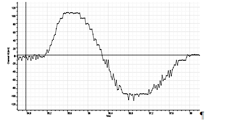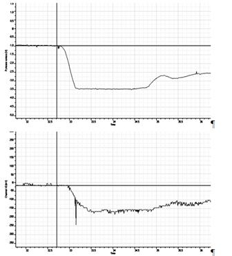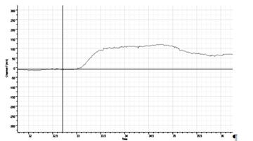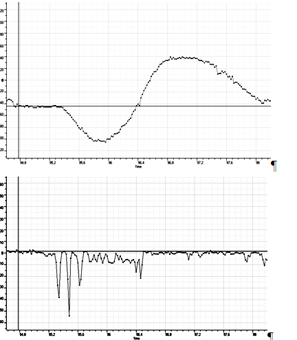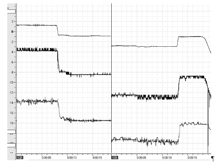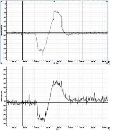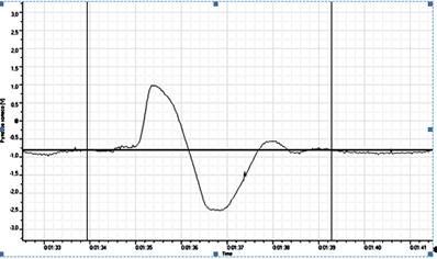 Рис. 16 Отрыв колеса в маневре «переставка» на мокром покрытии Учитывая важность с позиции безопасности дорожного движения экспериментально определялось время запаздывания рулевого управления. Записи углов поворота рулевого и отдельно левого и правого управляемых колес позволили для условий нештатного (критического) режима движения определить это время: левое УК – 0,15 с, правое УК – 0,25 с (рис. 17).