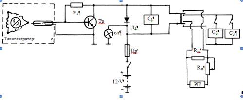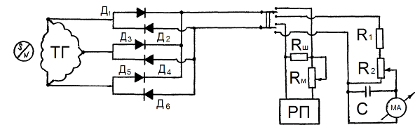 Рис. 6 Измерительная схема акселерометра: RД – 1,4 кОмR1 – 750ОмРП - регистрируемый прибор, RБ – 470 кОмR2 – 1,1 кОмМА – измерительный прибор, RА – 22 кОмR3 – 1,1 кОмRш – шунтирующее сопротивление, R4 – 750 ОмRм – масштабное сопротивление, R5 - 9,1 кОм В статическом положении, когда движок датчика находится на средине, измерительный мост должен находится в равновесном состоянии, а стрелка измерительного прибора на «нуле». В противном случае произвести корректировку переменным балансировочным сопротивлением RБ. Смещение движка датчика создаст дисбаланс схемы, таким образом, мост выйдет из равновесного состояния, что будет отмечено стрелочным измерительным прибором. Корректировка максимальной амплитуды отклонения стрелки измерительного прибора осуществляется резисторами RА и R5. С помощью переключателя можно подключать схему к дополнительным стрелочным приборам или регистрирующему прибору. Для уменьшения погрешностей при регистрации показаний необходимо, чтобы полное сопротивление отключаемых стрелочных приборов было одинаковым с общим сопротивлением электрической цепи регистрирующего прибора. В случае не соответствия, произвести корректировку сопротивлениями RШ, RМ. При измерении продольных или поперечных ускорений может быть использован один и тот же датчик, но повернутый в горизонтальной плоскости на 90°. Следует учесть, что при измерении поперечных ускорений акселерометр должен находится в центре масс. Измерение скорости автомобиля Скорость движения автомобиля измеряется с помощью тахогенератора переменного тока (рис. 7). Тахогенератор представляет собой статор с тремя соединенными в треугольник обмотками, внутри которого в подшипниках крышек может вращаться ротор. Тахогенератор установлен на фланце поворотного кронштейна «пятого» колеса. Ось ротора тахогенератора связана с осью «пятого» колеса через штифтовое соединение. В результате вращения ротора при качении «пятого» колеса в обмотках статора наводится ЭДС прямо пропорционально угловой скорости ротора и сдвинутые по фазе на угол 120°. Так как радиус «пятого» колеса практически является величиной постоянной, то тахогенератор можно использовать как датчик линейной скорости центра «пятого» колеса, а, следовательно, и самого автомобиля. Принцип действия Сигнал с трехфазного тахогенератора переменного тока подается на двух-полупериодный выпрямитель составленный из шести полупроводниковых диодов. В схеме предусмотрена регулировка амплитуды выходного сигнала. Для этого выход выпрямителя тахогенератора нагружен переменным резистором.