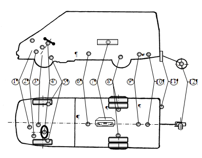 Рис. 2. Схема размещения измерительного оборудования в передвижной лаборатории на базе автомобиля ГАЗ-2705 Датчик положения дроссельной заслонки. 2. Датчик давления в тормозном приводе. 3. Расходомер топлива. 4. Датчик положения рулевого колеса и датчик момента на рулевом колесе. 5. Потенциометры углов поворота управляемых колес. 6. Датчик продольного и поперечного ускорения. 7. Самописец. 8. Датчики нормальной нагрузки на ось. 9. Гироскоп углов крена и продольного наклона кузова. 10. Гироскоп угловой скорости автомобиля. 11. Пиротехническое устройство. 12. Устройство «пятое колесо» (тахогенератор и геркон) 1.2 Электрические схемы основной измерительной аппаратуры передвижная лаборатория дорожный испытание Измерение и регистрация времени Исследуемые параметры автомобиля являются функциями времени. Поэтому их запись производится в реальном времени с отметкой его на ленте регистратора. Кроме того, время измеряется с помощью электрических, суммирующих приборов. Для измерения и регистрации времени при динамических и топливно-экономических испытаниях автомобиля ГАЗ 2705 использованы электроконтактные часы МЧ-62 (датчик меток времени), импульсные счетчики (суммирующие приборы), отметчики времени (самописец).