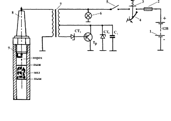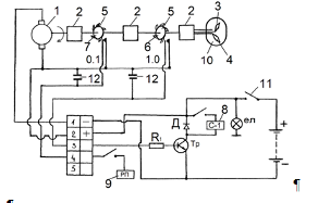 Рис. 3. Электроконтактные часы МЧ-62 1. Электродвигатель7. Контакты прерывателя 2. Шестеренчатые редукторы8. Импульсный счетчик 3. Малая стрелка9. Электромагнитный отметчик 4. Большая стрелка10. Шкала часов 5. Кулачки11. Выключатель 6. Контакты прерывателя12. Конденсаторы Схема, которая показана на рисунке 3, позволяет наносить отметки времени на ленту самописца через 0,1с и измерять время с помощью импульсного счетчика с точностью 1с. Принцип действия: Электродвигатель 1 часов, число оборотов которого стабилизировано центробежным регулятором, через шестеренчатые редукторы 2 вращает малую 3 и большую 4 стрелки часов и кулачки 5, которые своими выступами замыкают контакты прерывателей 6 и 7. Скорости вращения стрелок и кулачков подобраны так, что большая стрелка 4 делает один оборот за 5с, а малая 3 - за 50с. Прерыватели 6 и 7 замыкают свои контакты соответственно через 1,0 и 0,1с., то есть с частотой 1 и 10 Гц. При замыкании контактов выключателя 11 электродвигатель 1 включается в цепь питания, в результате чего якорь электродвигателя и кулачки 5 начинают вращаться, замыкая с указанными частотами контакты прерывателей 6 и 7, которые подают напряжение питания на базу транзистора Тр через сопротивление R1. В результате транзистор открывается и на обмотку электромагнитного счетчика подается напряжение тем самым, включая с помощью электронного реле импульсный счетчик. Конденсаторы 12 при этом уменьшают обгорание контактов прерывателей 6 и 7. Импульсные счетчики времени включают выключатели, расположенные на самих счетчиках. Для четкого срабатывания импульсного счетчика применяется усилитель постоянного тока на базе транзистора КТ – 829 с большим коэффициентом усиления, что позволяет облегчить режим работы контактной группы часов МЧ-62. Сопротивление R1 используется для установки режима работы транзистора, а диод Д применяется для шунтирования обратных выбросов напряжения на электрических обмотках электромагнита счетчика, которые могут привести к выходу из строя транзистора. Отметка времени на ленте регистрирующего прибора выглядит в виде прямоугольных импульсов, наносимых через 0,1с. Измерение тормозного пути Для измерения тормозного пути автомобиля применяется специальный отметчик начала торможения (рис. 4). Для поджига порохового заряда мелового отметчика начала торможения используется стандартный блок воспламенения горючей смеси предпускового подогревателя. Напряжение с автомобильной батареи подается через предохранитель 2, выключатель сигнала торможения 3, включатель 5 на первичную обмотку катушки высокого напряжения 7 и транзистор Тр блокинг- генератора. Блок преобразовывает напряжение 12 В АКБ в переменное высоковольтное напряжение, которое подается на свечу зажигания 8 пистолета 9. Стабилитроны СТ1, СТ2 и конденсатор С1 служит для защиты транзистора Тр от перенапряжений возникающих при работе генератора. Принцип действия При движении автомобиля с постоянной, определенной скоростью перед самым началом торможения включается тумблер 5. При нажатии на педаль тормоза срабатывает выключатель торможения 3 и происходит выстрел, а на дороге остается меловое пятно. Расстояние от мелового пятна до пистолета на остановившемся автомобиле является тормозным путем.