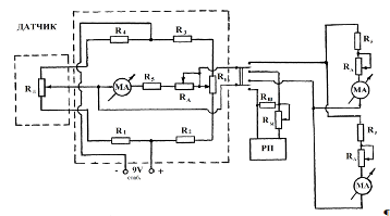 Рис. 4. Принципиальная схема отметчика начала торможений 1 –АКБ4; 2 – предохранитель; 3 - выключатель сигнала торможения; 4 - педаль тормозная; 5 – выключатель; 6 - сигнальная лампочка; 7 - катушка зажигания; 8 – свеча; 9 - пистолет-отметчик Измерение продольных и поперечных ускорений Измерения производятся акселерометром типа МП-95 (рис. 5). Конструктивно акселерометр представляет собой инерционную массу подвешенную на пружинах в горизонтальной плоскости. Непосредственно на подвижном элементе смонтирован потенциометр. При возникновении перегрузок инерционная масса смещается, преодолевая сопротивление пружин. Амплитуда перемещения инерционной массы пропорциональна величине действующего ускорения, которое регистрируется по величине электрического сигнала, снимаемого с потенциометра. Для измерения величины электрического сигнала используется измерительная мостовая схема (рис. 6). Переменные резисторы Rд и RБ являются соответственно датчиком и балансировочным сопротивлением. Резисторы R1,R2,R3,R4 дополнительные сопротивления, исключающие выход из строя прибора или обгорание контактов потенциометров. Выходной сигнал снимается с движков датчика и балансировочного резистора и подается на амплитудный регулятор RА