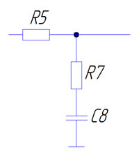 Рис. 5.1 - Пропорционально интегрирующий фильтр Применение фильтра в цепи ФАПЧ изменяет динамические свойства системы. Полином системы (многочлен в знаменателе передаточных функций) определяет порядок, вид аппроксимации и частотный диапазон фильтрации, а член или многочлен в числителе определяет вид фильтрации (нижних, верхних частот или полосовой фильтрации) и коэффициент передачи. В разрабатываемом генераторе с ФАПЧ используется один ПИФ-фильтр 1-го порядка, показанный на рис. 5.1 (необходимо отметить, что общепринятое название “фильтр” в данном случае является условным; правильнее было бы считать его цепью частотной коррекции). Пропорционально-интегрирующий фильтр может быть охарактеризован передаточной функцией (5.1): KФ(p) = Uвых/Uвх = (1 + Ф1)/(1 + Ф), (5.1) где RоC8 – “физическая” постоянная времени цепи ПИФ; Ф1 = 2RоC8 – условная постоянная времени; Rо= R7 + R5; Если учесть, что KФ = 1, т. е. Uвых = Uвх, в цепи генератора, то получим выражение (5.2) для определение номиналов элементов: 1 = 1+2 (R7+R5)C8/1+(R7+R5)C8.(5.2) R7 = 200 Ом; R5 = 10 кОм; C8 = 30 пФ;