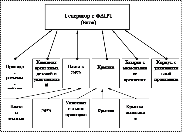 Рис. 11.1 - Схема сборочного процесса устройства На рисунке 11.1 представлен общий сборочный процесс устройства. Генератор АН468.757.001 представляет собой устройство, выполненнное на одной плате с использованием технологии поверхностного монтажа. ЭРЭ установлены с одной стороны платы в соответствии с РД107.460000.019-90. Данный стандарт разработан с учетом обеспечения возможности максимальной механизации и автоматизации технологических процессов сборки изделия. Плата с ЭРЭ установлена в металлический корпус, выполняющий роль электромагнитного экрана. Прибор предназначен для изготовления в мелкосерийном производстве. Это позволяет выбрать метод литья под давлением при изготовлении корпуса АН8.020.001. В качестве материала корпуса выбран литейный алюминиевый сплав АЛ9. Детали, получаемые литьем под давлением, имеют усадку, что необходимо учитывать при их конструировании. Очень важно, чтобы усадка была одинаковой по объему всей детали. В противном случае происходит коробление детали, что приводит к браку изделия. Избежать неравномерностей усадки можно, для этого необходимо соответствующим образом выбрать конфигурацию детали: толщина стенок должна быть примерно одинаковой, не должно быть острых углов и резких переходов от одной плоскости к другой. Алюминиевые сплавы имеют минимальную усадку при литье под давлением. Крышка АН301.250.001 крепится к основанию с помощью 6 винтов М2. Для осуществления герметизации между основанием и крышкой, а также в местах установки ВЧ – разъема, гнезда питания проложены уплотнительная резинка. В корпусе предусмотрены шесть приливов для установки винтов. Корпус является несущей конструкцией и экраном, а также защищает платы с элементами от влаги и пыли. 12. РАСЧЁТ И ОЦЕНКА ТЕХНОЛОГИЧНОСТИ КОНСТРУКЦИИ В соответствии с ГОСТ 18831-73 «Технологичность конструкции. Термины и определения». Технологичностью конструкции аппаратуры называется совокупность свойств конструкции, проявляющихся в возможности оптимальных затрат труда, материалов, времени при технической подготовке производства, изготовления, эксплуатации и ремонте, по сравнению с соответствующими показателями однотипных конструкций изделий того же назначения. Эта совокупность свойств должна быть обеспечена при установленных значениях показателей качества и принятых условиях изготовления, эксплуатации и ремонта. Условия изготовления или ремонта изделия определяются специализацией и организацией производства, применяемыми технологическими процессами и годовой программой выпуска. Различается качественная и количественная оценка технологичности. Качественная оценка определяет целесообразность количественной оценки. Качественная оценка проводится обобщенно, на основании опыта специалистами – экспертами. Количественная оценка технологичности выражается показателем, численное значение которого характеризует степень удовлетворения требованиям технологичности конструкции. Целью такой оценки является обеспечение эффективной отработки аппаратуры на технологичность при снижении затрат времени и средств на ее разработку, технологическую подготовку производства, изготовление, эксплуатацию и ремонт. Номенклатура основных показателей приведена в ОСТ 4Г0.091.219-76. Она может дополняться с внедрением новых конструктивных решений и прогрес