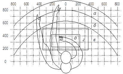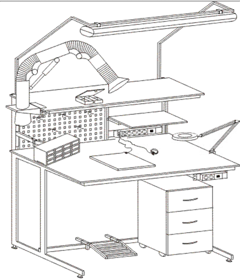 Рис. 15.2.1 - Зоны досягаемости рук в горизонтальной плоскости Разрабатываемое устройство должно находится в зоне Д, в зоне Г и В рекомендуется располагать часто используемое оборудование: паяльник или паяльно-ремонтную станцию, флюс, припой и т. д. В зонах А и Б рекомендуется размещать выключатели питания, контрольно-измерительную аппаратуру и т. д. На рабочем месте не должны находиться ненужные для рабочего процесса материалы, приспособления и оборудование. Захламленность рабочего места часто приводит к производственному травматизму. Размещение инструментов в инструментальном шкафу, измерительных приборов, инструментов и приспособлений, заготовок и деталей в строгом порядке на рабочем месте снижает утомляемость работника. Типовое рабочее место ремонтника включает в зоне электростатической безопасности, следующие антистатические объекты: паяльную станцию (например, ERSA Analog 60A), монтажный инструмент (с изолирующими ручками), контрольно–измерительную аппаратуру (например, мультиметр), контейнеры с компонентами, настольный коврик, браслет с гарнитурой (например, 8РК–611), объединительный узел заземления, напольное заземляющее покрытие, стол и стул (полностью антистатический или с заземляющими чехлами на сиденье и спинке). Настольный антистатический коврик обычно двухслойный: верхний его слой рассеивающий, а нижний – проводящий. Коврик должен быть износостойким, негорючим, термостойким (чтобы выдерживать случайные прикосновения паяльником), не выделять газов, иметь спокойную однотонную расцветку. На рисунке 16.2 показан примерный вид оснащения рабочего места ремонтника (электрическое оборудование и кресло не показано). Антистатическое покрытие пола должно быть матовым c цветными вкраплениями, чтобы не выделялись места потертостей после длительной эксплуатации. Покрытие пола должно быть износостойким, шумопоглощающим, негорючим, термостойким, не выделять газов. Оно крепится на напольную металлическую сетку или сборные металлические плитки проводящим клеем. Антистатический стул (кресло) должен иметь негорючее, термоcтойкое покрытие с сопротивлением порядка 1Мом и временем стекания заряда не более 0,5 с; конструкция стула должна соответствовать стандартам эргономичности. Спецодежда с антистатической маркировкой (халаты, футболки) для работы в зоне антистатической защиты имеет в составе ткани 96% хлопка и 4% проводящего волокна, обеспечивающего сопротивление порядка 3 МОм и время стекания заряда не более 0,3 с; число стирок без утраты антистатических свойств – не менее 50.