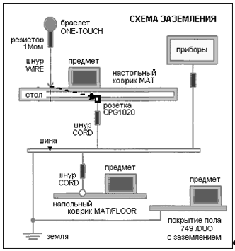 Рис. 15.2.2 - Оснащение рабочего места ремонтника Обувь изготавливается на основе натуральной кожи с сопротивлением не более 3,5 МОм. При отсутствии специальной обуви используются заземляющие ремешки для стекания заряда с лодыжечной части ноги человека на покрытие пола. Разумеется, рабочую одежду и обувь следует содержать в чистоте в соответствии с СанПиН 2.2.2.540–96 "Гигиенические требования к ручным инструментам и организации работ". На ответственного сотрудника возлагаются функции ежедневного контроля над соблюдением правил антистатической безопасности. В распоряжении координатора должны быть приборы контроля влажности, статического заряда, сопротивления. Периодически должен проводиться также независимый антистатический аудит. Необходимым условием безопасной для зрения работы является наличие бестеневой лампы с увеличивающей линзой, например 8РК–F120NB. Правильный выбор и расчет освещенности рабочего места и производственного помещения обеспечивают в соответствии с главой СНиП П–4–79, рекомендуется применять комбинированное освещение. Системы вентиляции, отопления и кондиционирования воздуха должны быть выполнены в соответствии с главой СНиП 2.04.05–91. Рабочее место ремонтника должно быть оборудовано принудительной вентиляцией со скоростью вытяжки воздуха на месте пайки - не менее 0,6 м/сек (СанПин 952–72), причем рециркуляция воздуха внутри помещения запрещена. Вентиляционные устройства необходимо очищать не менее раза в месяц. При данных мероприятиях концентрация аэрозолей свинца на рабочем месте не должна превышать 0,005–0,01 мг/м3. Гигиенические требования к микроклимату ремонтного помещения должны соответствовать СанПиН 2.2.4.548–96 и Р 2.2.755–99. Концентрация пыли на рабочих местах не должна превышать 6 мг/м3(п.892б СанПиН N 4617–88). Не реже одного раза в две недели должна выполняться общая влажная уборка всего рабочего помещения. Уровни шума на рабочих местах должны соответствовать требованиям ведомственных строительных норм ВСН 601 – 92 "Допустимые уровни шума на предприятиях связи". 15.3 Мероприятия по электробезопасности (ГОСТ 12.1.030-81) Помещение, в котором находятся рабочие места ремонтников, по степени поражения электрическим током относится к категории помещений без повышенной опасности. Для питания измерительных приборов и устройства на рабочем месте используется сеть переменного тока напряжением 220 В, частотой 50 Гц с глухозаземленной нейтралью. Электропитание рабочего места должно быть подключено через рубильник, установленный в месте, удобном для быстрого отключения питания рабочего места, должны быть предприняты меры для обесточивания рабочего места в аварийных режимах. В сети с глухозаземленной нейтралью при однофазном замыкании на корпус необходимо обеспечить автоматическое отключение поврежденного электрооборудования. Этого можно добиться только прокладкой специального провода достаточной проводимости – нулевого провода, к которому присоединяются корпуса электрооборудования На рис. 16.3 приведена рекомендательная схема заземления производственного помещения с учетом требований электробезопасности и антистатики.