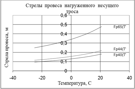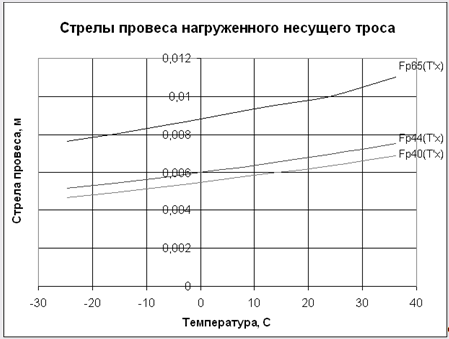 По результатам расчетов строятся зависимости стрелы провеса нагруженного несущего троса от температуры. Все расчёты сводим в таблицу 4. Таблица 4 - Зависимость стрел провеса от температуры