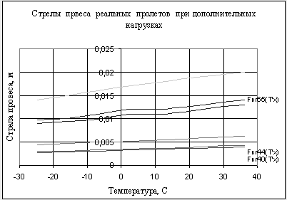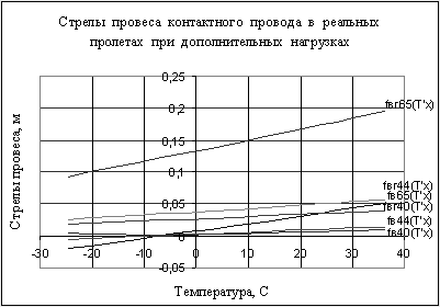 По результатам расчетов строятся стрелы провесов реальных пролетов при дополнительных нагрузках. Все расчёты сводим в таблицу 5. Таблица 5 - Зависимость стрел провеса от температуры