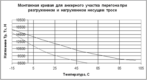 Рисунок 2 - Монтажная кривая Расчеты натяжения несущего троса при режимах с дополнительными нагрузками производятся по формуле, где величины с индексом (x) относятся к искомому режиму (гололеда с ветром или ветер максимальной интенсивности). Полученные результаты наносятся на график. Согласно выражению(61):