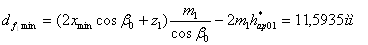 14. Толщина зуба рейки у ножки Sfn2=2(r2- rf2)tga0+0,5pmn=4,119 мм (53) 15. Ширина впадины у ножки Sef2=pmn- Sfn2=1,85 мм (54) 16. Толщина головки зуба рейки San2=0,5 pmn-( rNa2+0,1- r2)2tga0=1,183 мм (55) 17. Радиус основания ножки зуба рейки Pf2=0,5 Sef2×tg(450+0,5d0)=1,32 мм (56) 18. Минимальное число зубьев рейки z2min: