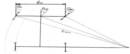 Рис. 1. Определение длины боковой тяги. Рулевое управление типа 4, которое устанавливается на легковые автомобили фирмы Фольксваген, отличается легкостью хода и недорого в изготовлении. К недостаткам следует отнести повышенные нагрузки отдельных деталей и возможное в результате этого снижение жесткости. Для предотвращения вызываемого изгибающим моментом прогиба/скручивания зубчатая рейка имеет относительно большой диаметр – 26 мм. На практике выбор типа реечного рулевого управления производится из компоновочных соображений. В нашем случае из-за отсутствия места для размещения рулевого механизма внизу, принято верхнее расположение рулевого механизма. Это обуславливает применение рулевого управления типов 3,4. для обеспечения прочности и жесткости конструкции окончательно принимается верхнее расположение рулевого механизма и тип 3 рулевого управления. Следует признать, что такая компоновка рулевого управления не является самой удачной. Высокое расположение рулевого механизма обуславливает его большую податливость из-за прогиба амортизационных стоек. При этом наружное колесо прогибается в сторону положительного развала, внутреннее – в сторону отрицательного. В результате колеса дополнительно наклоняются в направлении, куда их уже стремятся наклонить боковые силы при движении в повороте. Кинематический расчет рулевого привода. Кинематический расчет заключается в определении углов поворота управляемых колес, нахождении передаточных чисел рулевого механизма, привода и управления в целом, выборе параметров рулевой трапеции, а также в согласовании кинематики рулевого управления и подвески. 1.4 Определение параметров рулевой трапеции Вначале рассчитывается максимальный средний угол поворота управляемых колес, необходимый для движения автомобиля с минимальным радиусом. Согласно схемы, изображенной на рис.2.