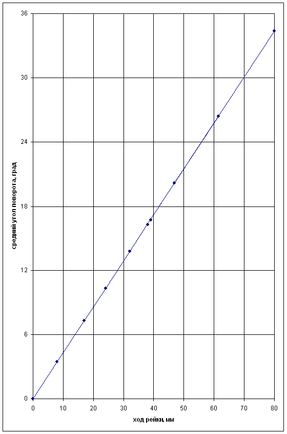 Рис. 4. Зависимость среднего угла поворота управляемых колес от хода рейки На рис. 4 показан график зависимости среднего угла поворота колес от хода рейки. Данные для построения графика получены с помощью программы WKFB5M1, которая применяется в отделе общей компоновки и отделе ходовой части и отделе тормозов УПШ ДТР ВАЗа для расчета кинематики подвески МакФерсон и реечного рулевого управления. По графику определяем, что для обеспечения угла поворота колес q=34,320 необходим ход рейки в одну сторону равный 75,5 мм. Полный ход рейки l=151 мм. На рис. 5 показана зависимость разности углов поворота наружнего и внутреннего колес в функции угла поворота внутреннего колеса. Здесь же приведена рассчитанная по Аккерману кривая требуемого изменения разности углов поворота колес. Показателем, служащим для оценки кинематики рулевого привода, является разность углов поворота колес при угле поворота внутреннего колеса, равном 200: 1.5 Передаточное отношение рулевого управления Общее кинематическое передаточное отношение рулевого управления, определяемое передаточными числами механизма Uр.м. и привода Uр.п. равно отношению полного угла поворота рулевого колеса к углу поворота колес от упора до упора: