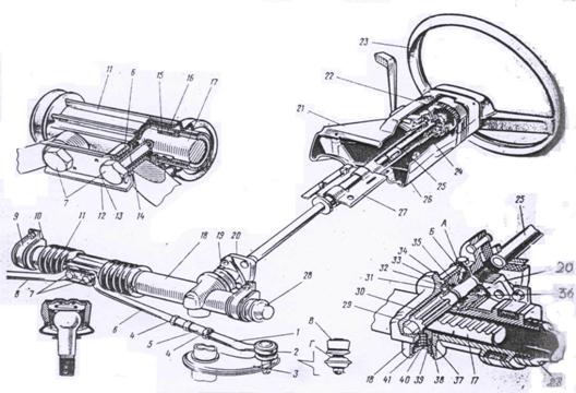 Рис.8. Рулевое управление автомобиля ВАЗ-2110 состоит из рулевого механизма реечного типа и рулевого привода. Конструкцией, представленной в графической части данного дипломного проекта, является реечный рулевой механизм с тягами в сборе, а также рабочие чертежи его деталей. Реечные рулевые механизмы более распространены, так как обладают малой массой, высоким КПД и повышенной жесткостью, хорошо компонуются с гидравлическими усилителями, что обусловило их использование на легковых автомобилях с передним расположением двигателя, например, на ВАЗ-2110 применяют рулевое управление из-за того, что у данной модели автомобиля максимальная нагрузка на управляемую ось до 24 кН. Схема рулевого управления автомобиля ВАЗ-2110 представлена на рис.8. На этом рисунке: 1 - головка наконечника тяги; 2 - шаровой шарнир; 3 - поворотные рычаги; 4 - гайки; 5 - трубчатая тяга; 6 - горизонтальные тяги; 7 - болты; 8 - крепящая тяга; 12 - соединительная пластина; 13 - стопорная пластина; 14 - резинометаллический шарнир; 15 - уплотнительные кольца; 16 - втулка; 17 - рейка; 18 - картер; 19 - хомут; 20 - эластичная муфта; 21 - рулевые тяги; 22 - демпфирующий элемент; 23 - рулевое колесо; 24 - шариковый радиальный подшипник; 25 - вал; 26 - рулевая колонка; 27 - кронштейн; 28 - защитный колпачок; 29 - роликовый подшипник; 30 - приводная шестерня; 31 - шариковый подшипник; 32 - стопорное кольцо; 33 - защитная шайба; 34 - уплотнительные кольца; 35 - гайка; 36 - пыльник; 37 - резиновое кольцо; 38 - стопорное кольцо; 39 - металлокерамический упор; 40 - пружина; 44 - гайка. На рис.9 изображен рулевой механизм реечного типа с тягами в сборе.