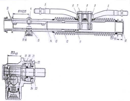 Рис. 9. Данная конструкция включает в себя: 1 - защитный колпачок; 2 - картер рулевого механизма; 3 - рейка рулевого механизма; 4 - приводная шестерня; 5 - рулевая тяга; 6 - распорная втулка, ограничивающая ход рейки; 7 - болт крепления рулевой тяги, затягивают с моментами 7,8±0,8 кгс×м и законтривают их отгибанием краев стопорной пластины на грани болтов; 8 - соединительная пластина; 9 - упорная втулка; 10 - опора рулевого механизма, плотно прилегающая к чехлу; 11 - опорная втулка рейки; 12 - защитный чехол, установленный так, чтобы его правый торец находился на расстоянии 28,5-0,5 мм от торца трубы, и закрепленный хомутами; 13 - хомут; 14 - упорное кольцо рейки, ограничивающее ход рейки; 15 - уплотнительное кольцо упора рейки; 16 - гайка; 17 - упор рейки; 18 - роликовый подшипник; 19 - шариковый подшипник; 20 - стопорное кольцо; 21 - уплотнительное кольцо гайки; 22 - гайка крепления подшипника шестерни; 23 - пыльник; 24 - шайба; 3. Проверочный расчёт на прочность зубчатого зацепления Статическая нагрузка от рулевого колеса