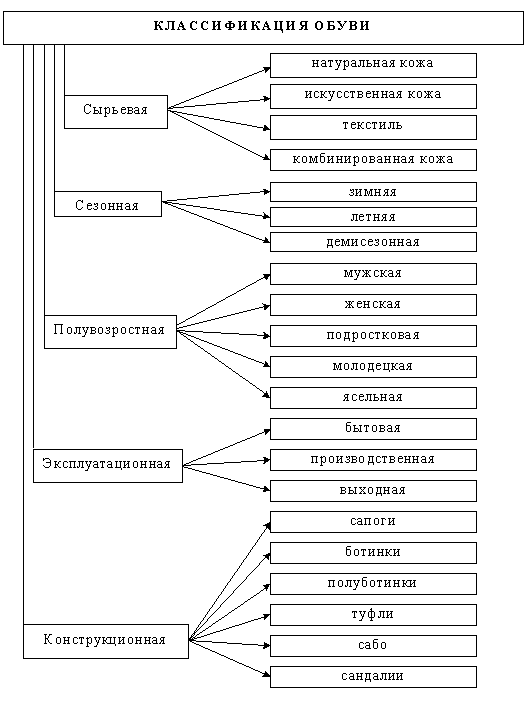 Рис.6. Классификационная ассортиментная группировка обуви ООО "Транс Обувь Торг" Продукция, реализуемая на предприятии, имеет ряд недостатков, а именно: - при существующем соотношении новизны моделей, качества и цены (указанной в прайс-листе) продукция предприятия, по мнению специалистов "Виамэкс консалтингс", не конкурентоспоспособна на Московском рынке; - коллекция 2010 года является слегка устаревшей (соответствует 2008 году). Однако, может пользоваться спросом в регионах России; - применение в производстве устаревших колодок, мало соответствующих последним стандартам мирового рынка обуви. В настоящее время на предприятии занимаются разработкой новых моделей обуви, при этом учитываются вышеперечисленные недостатки. К преимуществам планируемых к производству и реализации видов модельной женской и мужской обуви, следует отнести: - высокое качество производства выпускаемых видов модельной женской, детской и мужской обуви, обеспеченное применением детально разработанного технологического процесса и комплектующих новейших марок; - широкая область применения женской и мужской обуви, в зависимости от специфики пользователя - как модельной, так и специальной; - распространенность и относительная известность на обувном рынке имиджа торговой марки EberKlaus, как обуви хорошего качества. Планируемая продукция будет высокотехнологична, так как будет изготавливаться на новейшем импортном оборудовании и из высококачественной кожи. Отмечается, что ООО "Транс Обувь Торг" в достаточной степени обеспечено измерительной и испытательной техникой для текущего контроля под всеми этапами технологического процесса производства обуви, но и системой входного контроля качества поступающих в производственный процесс комплектующих и материалов. Таблица 1. Ассортимент выпускаемой продукции ООО "Транс Обувь Торг" в 2010 г. Секция 1. Обувь.