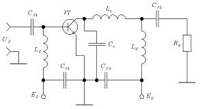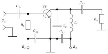 частоти, при яких відносні втрати Збудження транзисторів, що працюють у ключовому режимі, звичайно виробляється гармонійним струмом з великою амплітудою, при якій імпульси іК мають майже прямокутну форму. Тому потужність, споживана базовим ланцюгом від попереднього каскаду, виявляється порівняно великий, а коефіцієнт підсилення по потужності Кр ГЗЗ у ключовому режимі помітно нижче чим КР ГЗЗ у ННР. Недоліки ГЗЗ у ключовому режимі з активним навантаженням — швидкий ріст утрат зі збільшенням робочої частоти і низьке значення КР — обмежують область їхнього застосування. Істотно нижче втрати при роботі на високих частотах мають ГЗЗ у ключовому режимі з формуючим контуром. Ідея такого ГЗЗ полягає в тому, що паразитні елементи Сп і Lп у цьому ГЗЗ входять до складу коливального контуру CкLк (рис. 4), транзистор знаходиться в одному з двох станів: відсічення або насичення і відкривається і закривається в ті моменти часу, коли напруга на колекторі (на ємності Ск) дорівнює нулеві. Схеми ГЗЗ у ключовому режимі з активним навантаженням (див. рис. 1) і формуючим контуром (рис. 4) однакові; розходження полягає лише в тім, що в другій схемі елементи Ск, Lк, Cб2 утворюють коливальний контур, набудований на частоту, близьку до робочої.