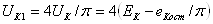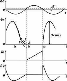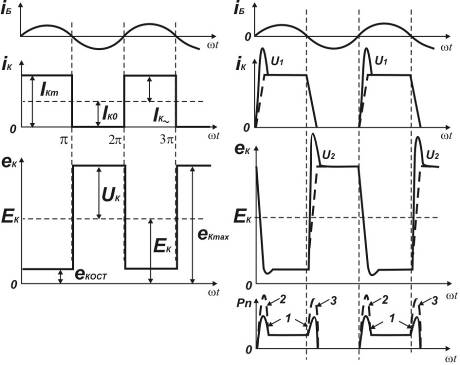 оскільки Ск На інтервалі відсічення ємність Сп заряджається до напруги 2ЕК – еК ост, а потім відразу після переходу транзистора в режим насичення розряджається на опір rнас. Унаслідок цього на початку кожного імпульсу колекторного струму виникає вузький розрядний імпульс U1, (див. рис. 2,6), а на епюрі потужності втрат з'являється додатковий сплеск 2 (див. рис. 2,6 унизу). Потужність утрат через ємність Сп пропорційна цієї ємності, квадратові напруги Ек і частоті появи сплесків, тобто робочій частоті fp :