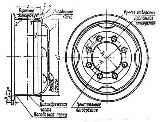Рис. 1. Основные параметры колес 1 - диск; 2 - обод; 3 - бортовое кольцо; 4 - замочное кольцо 2. Диаметр d и угол наклона у посадочных полок. Посадочные полки обода являются основанием, на которое опираются борта шины. Посадочные полки обода выполняются с углом конуса 5, 10 и 15 градусов. В результате натяга бортов шины на коническую полку обеспечивается полная их посадка и исключается проворот шины относительно обода. Плотная посадка бортов шины на ободе способствует герметизации колеса, что необходимо при применении бескамерных шин. 3. Профиль бортовых закраин. Конфигурация профиля закраины соответствует наружному профилю борта. Наиболее важно для работы шины имеет размер высоты закраины h. Она зависит от размеров профиля обода и шины. Ширина бортовой закраины в выбирается исходя из условий, исключающих порез боковины шины при максимальной её деформации. Центральная часть колеса - это переходное звено, связывающее обод колеса со ступицей экипажа. Выполняется эта часть либо в виде штампованного диска, постоянно соединенного с ободом, либо в виде массивных, полых, чаще литых спиц, являющихся составной частью ступицы. 1.1 Классификация колесКолеса, так же как и шины, принято классифицировать по их принадлежности к тому или иному типу машин с выделением в отдельную группу колес, предназначенных для специфических эксплуатационных условий. Таким образом, основные группы, на которые делится ассортимент колес, следующие, а именно для: 1. легковых автомобилей; 2. грузовых автомобилей, автобусов, троллейбусов, прицепов; 3. тракторов и сельскохозяйственных машин; 4. специальных условий эксплуатации. По типу применяемых шин колеса подразделяют для: 1. камерных шин; 2. бескамерных шин. По конструкции колеса могут быть: 1. дисковыми; 2. бездисковыми. По конструкции обода колеса делят на: 1. однокомпонентные (неразборные); 2. многокомпонентные (разборные). По конфигурации профиля обода колеса могут быть: 1.разборными (плоскими и полуглубокими) 2.неразборными (глубокими). По технологии изготовления обода делятся на: 1. обода из горячекатаного проката; 2. штампованные; 3. профилированные; 4. комбинированные, отдельные элементы которые могут быть получены различными, перечисленными выше способами. Особенности колеса как механизма. Основным преимуществом колеса как механизма является возможность экономии работы при перемещении груза за счет замены трения скольжения, возникающего на границе двух взаимно перемещаемых тел, значительно меньшими по величине трения качения. 1.2 Требования, предъявляемые к колесамОбеспечение надежности работы машины в течение всего срока службы. Колесо должно иметь минимальный вес. Момент инерции, т.е. маховой момент колеса, должен быть как можно меньше. Колесо должно иметь допустимые величины дисбаланса, радиального и осевого биения. Колесо должно обеспечивать хороший отвод тепла. Конструкция колеса должна обеспечивать минимальную трудоемкость монтажа и демонтажа шины на обод и установки колеса на автомобиль или трактор. Для колес, предназначенных под установку бескамерных шин, обязательным требованием является герметичность обода, так как без этого вообще невозможна эксплуатация. 2. Пневматические шиныПневматические шины должны обеспечивать: 1. плавность движения машин при эксплуатации их в различных дорожных условиях, бла