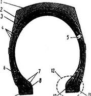 Рис.2. Устройство покрышки: 1-беговая дорожка;2-протектор;3- подушечный слой (брекер);4-слои корда;5- каркас;6-боковина; 7-крепительные ленты крыла;8-проволочное кольцо;9-бортовая лента; 10-носок; 11 -пятка; 12-борт покрышки. 2.3 Протектор шинПротектор состоит из толстого профилированного слоя резины с определенным рисунком, обеспечивающим сцепление шины с дорогой. Протектор накладывается на подушечный слой покрышки. Часть протектора, соприкасающаяся непосредственно с поверхностью дороги во время качения колеса, называется беговой дорожкой. Протектор шины воспринимает удары со стороны неровностей дорожной поверхности, предохраняя каркас от проколов, порезов, прорывов. Протектор подвергается постоянному воздействию солнечных лучей и осадков. Для шин грузовых автомобилей толщина протектора равна 14,5...32,0 мм. Рисунок протектора шины должен обеспечивать: - высокое сцепление шины с поверхностью дороги; - предохранение колеса от продольного и бокового скольжения (поперечные канавки протектора предотвращают продольное скольжение, а продольные - поперечное скольжение, занос); - отвод влаги по канавкам и хорошую самоочищаемость шины; - отвод тепла, образующегося при качении шины; - эластичность протектора, мягкость и бесшумность движения машины и др. Рисунки протектора можно разделить на три основных типа (рис. 3): дорожный, повышенной проходимости, универсальный (комбинированный). Рисунок протектора повышенной проходимости состоит из массивных грунтозацепов, разделенных широкими и глубокими канавками. Рисунки протектора выполняются в виде «елки», «косой елки», «расчлененной елки» и др. Расположение грунтозацепов под углом к центральной линии беговой дорожки покрышки способствует увеличению плавности взаимодействия шины с дорогой при качении колеса. Покрышки с таким рисунком предназначены для эксплуатации в условиях бездорожья, на мягких грунтах, на дорогах, покрытых грязью или снегом, и используются для самоходной техники. В этих условиях косые и глубокие грунтозацепы обеспечивают хорошее охлаждение шины. Однако эти шины из-за отсутствия продольных канавок на протекторе слабо защищают машину от боковых заносов на крутых поворотах и при движении по профилированной дороге, а также по дороге, покрытой жидкой грязью, льдом или плотно укутанным снегом. 2.4 КамераКамера тракторной шины представляет собой кольцеобразную замкнутую резиновую трубу с воздушным клапаном, который называется вентилем. Камера служит только для удержания сжатого воздуха. В зависимости от типов шин камеры выполняются с различной толщиной стенок (1,5...5,0 мм). Камеры изготовляются из специальных резин с большим содержанием натурального или синтетического каучука (до 45...50%). Так как автомобильные камеры не могут сохранять избыточного давления воздуха даже при незначительных проколах, то наряду с обычными выпускают специальные камеры. Они мало чувствительны к проколам и выполняются: - с утолщенными стенками и тканевой прослойкой; - с клеевой массой, помещаемой в ячейках по беговой части камеры; - с губчатой резиной, заполняющей внутреннюю часть покрышки; - с диафрагмой во внутренней полости камеры. Размеры камер соответствуют типу и размеру покрышек, с которыми они комплектуются. 2.5 Вентили камерВентиль камеры представляет собой воздушный обратный клапан, которы