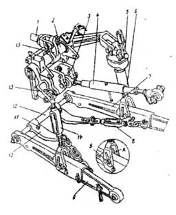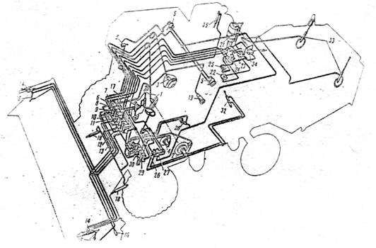 Рис.7. Монтажная схема гидросистемы (позиции те же, что и на рис.6) 6.2 ГидровибраторДля разрушения сводообразования и ускорения выгрузки влажного зерна в бункере комбайна предусмотрено специальное виброустройство, на приводе которого устанавливается гидровибратор. Он закрепляется в нише стенки бункера и шарнирно соединяется с колебательной площадкой, которая располагается параллельно дну бункера. При выгрузке зерна, когда вибратор включен соответствующим рычажком, расположенным в кабине, шток его пульсирует и сообщает площадке колебательные движения малой амплитуды и большой частоты. Под их действием слой зерна, граничащий с площадкой, течет по наклонной плоскости к выгрузному шнеку. Вибратор состоит из корпуса, поршня со штоком и золотника с пружиной, регулирующего направление нагнетания и слив масла. Частота колебаний поршня 20...25 периодов в секунду, амплитуда - 2,3.. .2,8 мм. 6.3 Гидросистема привода ходовой частиМосты ведущих колес зерноуборочных комбайнов «Дон-1500», «Енисей-1200Н», кормоуборочного комбайна КСК-100, косилки-плющилки КПС-5Г и др. оснащаются объемным гидравлическим приводом ходовой части. Объемная гидропередача с замкнутой циркуляцией выполнена по закрытой схеме. От двигателя к мосту ведущих колес передача крутящего момента осуществляется с бесступенчатым регулированием и реверсированием скорости движения и силы тяги комбайна. Такая передача обладает быстродействием, низкой инерционностью и состоит из регулируемого аксиального - плунжерного насоса со встроенными в него насосами подпитки и золотником сервомеханизма, нерегулируемого гидромотора, фильтра тонкой очистки с вакуумметром, масляного радиатора, гидробака, всасывающих и сливных трубопроводов, гибких рукавов и высокого давления. В зависимости от направления потока жидкости высокого давления один из рукавов может быть нагнетательным, другой - сливным для гидромотора и всасывающим для гидронасоса. При работе объемной гидропередачи рабочая жидкость от гидронасоса к гидромотору, где энергия потока преобразуется в механическую энергию, вращающую вал гидромотора и соединенные с ним через коробку диапазонов и бортовые передачи ведущие колеса моста. Назначение, краткое описание устройств и принцип действия дополнительного и вспомогательного оборудования мобильных машин.7. Дополнительное рабочее оборудование тракторовЕго используют при выполнении специальных работ или при специфических условиях эксплуатации. Оно не входит в комплектацию тракторов и поставляется по требованию заказчика, причем необходимые агрегаты и механизмы могут быть установлены на машину на заводе - изготовителе. К примеру, в дополнительное рабочее оборудование трактора МТЗ-80 входят: догружатели ведущих колес, регуляторы глубины обработки почвы, пневматическая система тормозов прицепов, предпусковой подогреватель двигателя и другое оборудование. 7.1 Догружатели ведущих колесДля увеличения силы тяги колесного трактора нужно уменьшить буксование его ведущих колес. Это можно сделать за счет увеличения сцепной силы, т.е. силы, прижимающей ведущие колеса трактора к почве. С этой целью на тракторах устанавливают специальные устройства - механические и гидравлические догружатели. Механический догружатель ведущих колес. Устройство Догружатель представляет собой кро
