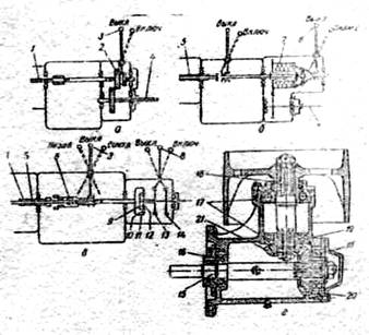 Рис. 5. Типы валов отбора мощности и приводной шкив: а - зависимый привод ВОМ; б — независимый привод ВОМ с многодисковой муфтой сцепления; в - независимый привод ВОМ с планетарным механизмом; г - приводной шкив; 1 -вал коробки передач; 2 - передвижная шестерня; 3 3,8 - рукоятки управления; 4 - вал отбора мощности; 5 - промежуточный вал; 6 - передвижная зубчатая муфта; 7 - многодисковая муфта сцепления; 9 - водило; 10-сателлиты; 11- коренная шестерня; 12- солнечная шестерня; 13- тормоз солнечной шестерни; 14- тормоз вала отбора мощности; 15,18 - валы приводного шкива; 16,17 - подшипники валов; 19 - корпус приводного шкива; 20, 21 - конические шестерни. 5. Рабочее оборудование автомобилейК основному рабочему оборудованию автомобилей можно отнести подъемный механизм кузова автомобиля, буксирное и опорно-сцепное устройства. 5.1 Подъемный механизм грузового автомобиляАвтомобили - самосвалы оборудованы металлическим кузовом, который можно поднимать и наклонять при помощи гидравлического подъемника с приводом от двигателя. Подъемный (самосвальный) механизм облегчает разгрузочные работы. Механизм опрокидывания платформы самосвального кузова представляет собой гидравлический цилиндр, корпус которого шарнирно соединен с рамой автомобиля, а шток поршня рычажным механизмом - с платформой кузова. Управляют механизмом опрокидывания кузова из кабаны водителя рычагом, включающим или выключающим коробку отбора мощности и проворачивающим кран. 5.2 Буксирное устройствоГрузовые автомобили часто используют как тягач для буксирования прицепов или других автомобилей. Для этой цели автомобили оборудуют буксирным устройством, представляющим собой стержень с крюком, установленным в задней части рамы автомобиля. Рама автомобиля в месте крепления буксирного устройства усилена дополнительными поперечинами и раскосами. Крюк буксирного устройства запирают защелкой с собачкой, удерживающей защелку от самопроизвольного открывания, и при закрытом крюке фиксируют шплинтом, вставляемым в отверстие защелки. Стержень крюка установлен в корпусе, в котором между двумя упорными шайбами помещен резиновый буфер, зажатый гайкой, навернутой на стержень крюка. Такое устройство предохраняет раму автомобиля и соединительные элементы прицепа от резких ударов и толчков при трогании с места и торможении. 5.3 Опорно-сцепное устройствоОно применяется на седельных тягачах и служит для шарнирного соединения тягача с полуприцепом. Оно состоит из опорной плиты, балансира с осями, плиты и замка в виде захватов, устанавливаемых на осях на плите седельного устройства и фиксирующихся запорным кулаком. Кулак перемещают в переднее и заднее положение рукояткой. 6. Рабочее оборудование комбайновВсе основные операции управления комбайном, требующие регулировок в процессе работы, выполняются гидравлически исполнительными цилиндрами, управляемыми из кабины. На комбайнах «Нива», «Енисей» и «Дон - 1200» с механическим приводом ходовой части применяются две независимые гидросистемы: основная, предназначенная для управления рабочими органами комбайна, и гидросистема рулевого управления. В комбайнах « Дон - 1500» и «Енисей 1200Н» имеется третья гидросистема — привода ходовой части. Основная гидросистема и гидросистема рулевого управления имеют один общий масляный бак. Для гидросистемы привода ходовой ч