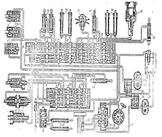 Рис.6. Принципиальная схема гидросистемы: 1,2,3 и 4 - гидроцилиндры управления шкивами главного контрпривода и привода барабана; 5 -вибраторы бункера для зерна; 6 - переливная секция для зерна; 7,8,9,10,11,12 и 13 - секции управления вибраторами бункера и гидроцилиндром воздухозаборника, выноса молотила, подъема мотовила, управления вариатором ходовой части, вариатора мотовила, механизма подключения привода жатки и подъема жатки; 14 - гидроцилиндры выноса мотовила; 15 - гидроцилиндры подъема мотовила; 16 - гидроцилиндр вариатора мотовила; 17 - гидроцилиндр отключения привода жатки; 18 - гидроцилиндры подъема жатки; 19 - гидроцилиндры вариатора ходовой части; 20 -гидроцилиндр обратной прокрутки молотильного барабана; 21 - масляный бак; 22 - насос основной гидросистемы; 23 - предохранительный клапан основной гидросистемы; 24 - предохранительный клапан гидросистемы рулевого управления; 25 - насос гидросистемы рулевого управления; 26 -насос-дозатор рулевого управления; 28 - гидроцилиндр управления выгрузным шнеком; 29 - секция управления вариатором первого барабана; 30 - секция управления гидроцилиндром выгрузного шнека; 31 - секция управления вариатором второго барабана; 32 - гидроцилиндр управляемого моста;33 - гидроцилиндры клапана копнителя; 34 - распределитель гидросистемы копнителя; 35 -гидроцилиндр воздухозаборника