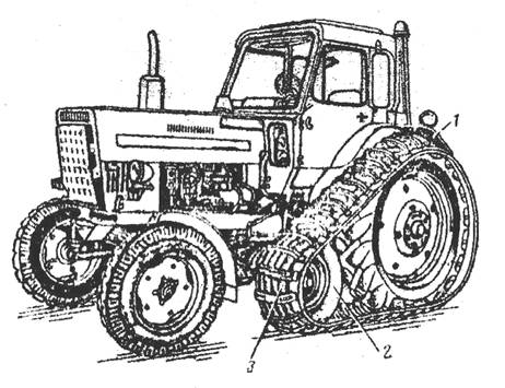 Рис.8. Трактор с полугусеничным ходом: 1 - гусеница; 2 - натяжное колесо; 3 - почвозацеп 8.2 Средства, повышающие проходимость автомобилейК ним можно отнести лебедку, цепи, браслеты и другие различные специальные устройства. Лебедка устанавливается на передней части рамы некоторых грузовых автомобилей повышенной проходимости. Она служит для подъема груза или самовытаскивания застрявшего автомобиля. Лебедка состоит из редуктора, барабана и привода. Мелкозвенчатые цепи используют для движения автомобиля по мягким грунтам, степной целине, скользким и обледенелым дорогам и в горных районах. Гусенечные цепи эффективны при движении по очень мягким грунтам, заболоченной местности и степной целине. Цепи используются на трехосных автомобилях и крепятся на колесах промежуточного и заднего ведущего мостов. Цепи противоскольжения надевают на колеса на подходе к труднопроходимому участку пути. Для этого цепи раскладывают спереди или сзади автомобиля по колее колес и медленно наезжают на середину цепей. Затем цепи натягивают и их концы соединяют замками. Двигаться с цепями противоскольжения по дорогам с твердым покрытием недопустимо, так как это ведет к повышенному износу шин. Цепные браслеты и противобуксовочные колодки можно надевать на колеса в случае легкого буксирования автомобиля. Траковые цепи используют для движения по мягким размокшим грунтам, разбитым грунтовым дорогам и в распутицу. Они применимы также для езды по заболоченной местности и снежной целине. 8.3 Средства, для создания удобства управления машиной и комфортностиДля создания удобств управления на современных тракторах и комбайнах устанавливают кабины автомобильного типа, и их интерьер фактически не отличается от интерьера салонов автомобилей. Кабины оборудуют вентилятором; кондиционером; защитным каркасом; ремнями безопасности; сиденьем, регулируемым по массе тракториста, высоте, вперёд - назад и по наклону спинки; удобным пультом управления; регулируемой рулевой колонкой; тонированными панорамными передними и боковыми стеклами; радиоприемниками и др. 9. Техническое обслуживание самоходных машин и оборудования, меры безопасности и вопросы экологии При техническом обслуживании трактора проверяют состояние обшивки, капота, остекления кабины, исправность и работоспособность стеклоочистителей, плотность закрывания дверей, состояние из замков. Проверяют и при необходимости регулируют сидения тракториста. Проверяют исправность освещения кабины, щитка приборов, устройства вентиляции, обогрева и увлажнения воздуха в кабине. Обнаруженные неисправности устраняют. Для автомобилей предусмотрены ежедневное, первое, второе и сезонное техническое обслуживания Ежедневное обслуживание (БО) 1 Осмотреть автомобиль, проверить состояние кабины, кузова, стекол, зеркала заднего вида, спидометра, оперения, окраски и номерных знаков. 2 Проверить запоры бортов платформы, дверей и неисправность подъемных механизмов стекол, а в зимнее время - исправность системы отопления. 3 Убрать кабину и платформу кузова. 4 Помыть автомобиль. 5 Обтереть облицовку радиатора, капот, крылья, стенки и стекла кабины и номерные знаки. 6 Заправить бачок насоса опрыскивателя ветрового стекла (там, где он имеется). Первое техническое обслуживание (ТО-1). 1 Осмотреть автомобиль, проверить состоян