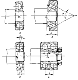 Ширину кілець В, монтажну висоту Т, параметр навантаження е, кут контакту б, а також d і D приймають за ГОСТами. Аналогічним чином ведеться розрахунок і у випадку, якщо в опорі встановлений подвійний підшипник або два однакових підшипники, але затягування підшипника таке, що водночас працює тільки один ряд тіл кочення. Якщо затягування таке, що водночас працюють обидва ряди тіл кочення й осьове навантаження має враховуватися при розрахунку, умовно місцем прикладання реакції вважають точку, що відстоїть від середини підшипника і сприймає осьове навантаження, на 1/3 відстані між рядами тіл кочення. Приблизно допускається сполучення розрахункового положення опори із серединою підшипника, який сприймає осьове навантаження. Якщо осьове навантаження при розрахунку підшипників враховуватися не повинно, розрахункова точка опори розміщується між підшипниками. На вихідні кінці валів часто встановлюють шківи ремінних передач,
