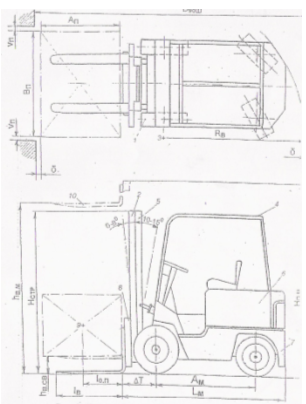 Рис. 1 Колесный фронтальный погрузчик с консольным грузоподъёмником общего назначения 1-ведущий мост; 2-внутренняя (выдвижная) рама грузоподъёмника; 3-центр поворота машин; 4-защитное сооружение; 5-наружная (неподвижная) рама грузоподъёмника; 6-моторный (аккумуляторный) отсек; 7-противовес; 8-каретка грузоподъёмника; 9-центр тяжести груза; 10-вилочный захват. Выбираем погрузчик «Сесаб»-ЕСО/Н12-1 с грузоподъёмностью Qп.п =1200 кг. Установим фактическую грузоподъёмность погрузчика определяется из условия постоянства величины опрокидывающего момента, т.е. при постоянном коэффициенте устойчивости погрузчика Ку.п=соnst. При укладке пакетов по схеме №2: Qп.ф= Qп.п*(lо.п+∆Т)/(lо.ф+∆Т), Где lо.п – фактическое расстояние от передней плоскости каретки до центра тяжести поднимаемого вилами пакета (мм); lо.ф=0,5Ап; ∆Т—расстояние от передней плоскости кареты до оси передних колёс, мм. Qп.ф=1200*(400+360)/(0,5*750+360)=1257,9 т. По рассчитанной фактической грузоподъёмности выбираем погрузчик «Сесаб»-ЕСО/Н12-1 и приводим его характеристики в таблице 4. Таблица 4. Характеристики погрузчика 4004М