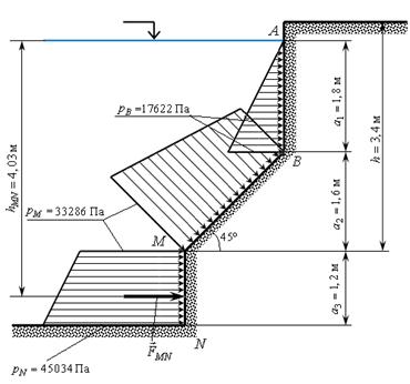 Рис.1. Расчетная схема к задаче 1 и эпюра избыточного давления. 3. Силу избыточного давления на указанную участок MN смоченной поверхности определим с помощью формулы [1, с.30]