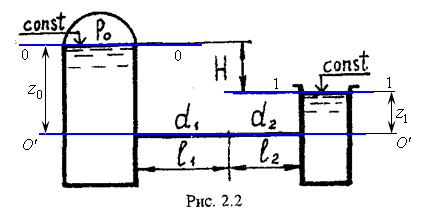 Рис.2. Расчетная схема к задаче 2 Решение: Рассмотрим установившееся движение воды в заданном трубопроводе (рис.2). 1. Составляем уравнение Бернулли в общем виде для сечений 0-0 и 1-1 (сечение 0-0 совпадает со свободной поверхностью воды в левом резервуаре, сечение 1-1 - со свободной поверхностью правого резервуара):