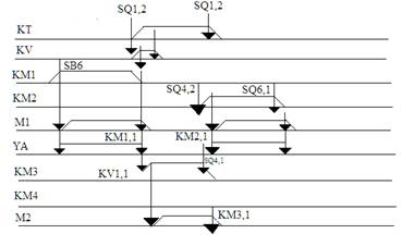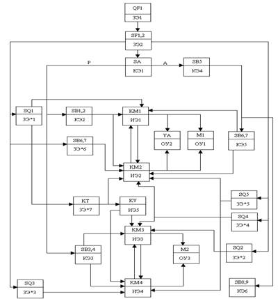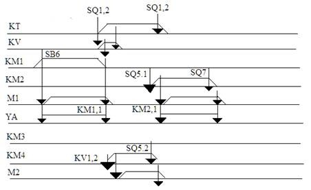Рис. 3. Временная диаграмма электротали Описание работы временной диаграммы электротали движении е вперед рис. 2. При нажатии кнопки SB6 запитывается KM1 которая своими контактами запитывает M1 и УА. При срабатывании SQ он своими контактами SQ1,2 запитывает KT, KV, а контакт SQ1,1 обесточивает KM1. Контакт KM1,1 обесточивает M1, УА. KV своим контактом KV1 запитает KM3, KM3 запитает M2. КТ через выдержку времени обесточит KV. При достижении SQ4 он своими контактами SQ4.2 запитает KM2, SQ4,1 обесточит KM3, KM3 обесточит M2. Катушка KM2 записывается и своими контактами запитает M1, УА. В это время воздействие на SQ1 прекратиться и KT обесточится через контакт SQ1,2. При достижении путевого выключателя SQ6, он обесточит KM2 который своими контактами обесточит M1 и УА. Описание работы временной диаграммы электротали движение назад рис. 3. При нажатии кнопки SB6 запитывается KM1 которая своими контактами запитывает M1 и УА. При срабатывании SQ он своими контактом SQ1,2 запитывает KT, KV, а контакт SQ1,1 обесточивает KM1. Контакт KM1,1 обесточивает M1, УА. KV своими контактом KV1 запитает KM4, KM4 запитает M2. KT через выдержку времени обесточит KV. При достижении SQ5 он своими контактами SQ5.2 запитает KM2, SQ5,1 обесточит KM4, KM4 обесточит M2. Катушка KM1 запишется и своими контактами запитает M1, УА. В это время воздействие на SQ1 прекратиться и KT обесточится через контакт SQ1,2. При достижении путевого выключателя SQ7, он обесточит KM2 который своими контактами обесточит M1 и УА. 5. Разработка функциональной схемы автоматизации Функциональная схема – это схема, отражающая взаимодействие устройств и элементов автоматизации, а также характеризующая их функции. Графически изображается в виде прямоугольников, в которых указывается тип элемента и его функция. Функциональная схема представляет собой чертеж, на котором условными обозначениями изображено оборудование, контрольно-измерительные приборы и средства автоматизации с указанием связей между ними. Система условных обозначений, принятая в этом стандарте, аналогична системам условных обозначений применяемым во многих странах мира, как социалистических, так и капиталистических. 1) Защитный элемент (ЗЭ) – обеспечивает защиту системы автоматизации от ненормальных режимов (автоматический выключатель, предохранитель, УВТЗ, тепловое реле, трансформаторы и т.д.); 2) Задающий элемент (ЗЭ*) – задает алгоритм функционирования системы, а так же эталонную величину, с которой сравнивается фактическое значение (реле времени, датчики, регулятор температуры и т.д.); 3) Сравнивающий элемент (СЭ) – сравнивает эталонную величину с фактической (датчики); 4) Сигнальный элемент (СЭ*) – сигнализирует о ходе протекания процесса (лампа, звонок); 5) Командный элемент (КЭ) – подает команду и задает режим работы процесса (кнопки, переключатель, рубильник и т.д.); 6) Исполнительный элемент (ИЭ) – преобразует управляемый сигнал, который воздействует на объект управления (магнитный пускатель, реле, диод и т.д.); 7) Управляющий элемент (УЭ) – формирует управляющий сигнал согласно алгоритму функционирования (конечный выключатель, реле времени и т.д.); 8) Объект управления (ОУ) – то, на что направлено действие (двигатель, лампы, электромагнитный клапан и т.д.). При подачи сигнала на шкаф управления запитывается автоматический выключатель QF(ЗЭ1). С ЗЭ1 сигнал поступает на автоматические выключатели SF1 и SF2 (ЗЭ2). С ЗЭ2 сигнал ид