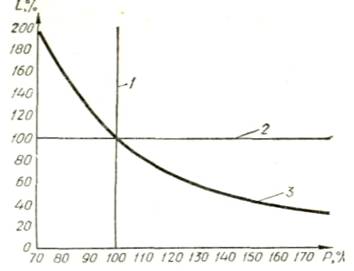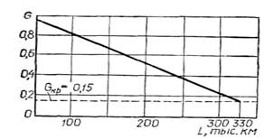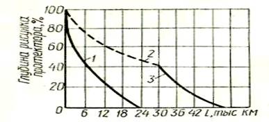 1 – нормальная нагрузка на шину; 2 – нормальный пробег шины; 3 – пробег шины при ненормированных нагрузках Рисунок 8 – Пробег шины в зависимости от нагрузки Значительное влияние на пробег шины оказывает пониженное против нормы давление воздуха в ней (рисунок 7). У протектора при этом интенсивно изнашиваются крайние беговые дорожки, повреждается каркас покрышки. Начавшееся разрушение каркаса сопровождается появлением темного кольца вдоль боковых стенок внутри покрышки и на стенках камеры. Затем нити корда отслаиваются от резины, перетираются и рвутся. Происходит кольцевой излом каркаса. Шина с таким дефектом не подлежит восстановлению. Недостаточное давление воздуха в шине может также вызвать и расслоение каркаса, отслоение протектора и боковин покрышки. Перечисленные дефекты, а также повышенный износ протектора при пониженном давлении воздуха в шине возникают вследствие изменения профиля шины во время движения, повышения напряжений в ее материале, теплообразования. Наибольший вред пониженное давление наносит шинам ведущих колес. Каркасы обеих сдвоенных покрышек разрушаются за счет соприкосновения и трения их боковин. Крайне вредна даже кратковременная эксплуатация шин с пониженным внутренним давлением. Это можно объяснить тем, что начавшийся процесс разрушения каркаса практически никак не проявляется внешне. Со временем же он приведет к преждевременному износу и выходу покрышек из строя. Пониженное давление воздуха в шинах вызывает перерасход топлива. На срок службы шин влияют неправильные углы установки передних колес, повышенный люфт в рулевом управлении, повреждения рулевых тяг, прогиб или перекос мостов, течь масла, выступающие детали кабин, кузова. Отрицательный развал передних колес, прогиб балок мостов вызывают ступенчатый износ внутренних дорожек протектора шин. Повышенное схождение управляемых колес приводит к износу наружной части протектора. Кромки истертых дорожек в этом случае острые. Такой же износ, но только внутренних дорожек, будет наблюдаться при отрицательном угле схождения колес. Причиной волнистого неравномерного износа протектора могут стать изношенные или ослабленные подшипники передних колес, поврежденные поворотные кулаки, погнутые рулевые тяги, неотрегулированное рулевое управление. Перекос мостов вызывает интенсивное истирание протектора. Причины местного пятнистого износа шин — дисбаланс колес, неисправные амортизаторы (у легковых автомобилей), затяжное торможение с заблокированными колесами. На долговечности шин сказываются и механические их повреждения, сопутствующие чаще всего неаккуратной езде. К механическим повреждениям относятся потертости, порезы, пробои покрышек о бордюрный камень, выступающие острые кромки горных пород, битых камней, кирпича и даже о выступающие поврежденные детали ходовой части и оперения кабины. На практике автомобили и шины часто перегружают. Это приводит к снижению долговечности шин (рисунок 8) вследствие повреждения каркаса практически таким же образом, как и при эксплуатации шин с пониженным давлением воздуха. Кроме того, на боковинах покрышки со временем появляются характерные прямые или извилистые довольно крупные разрывы. В зоне же боковой дорожки перегруженная шина хуже противостоит пробоям от наезда на дорожные препятс