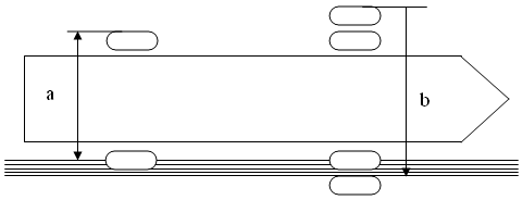 Рисунок 1 – Прогнозирование остаточного ресурса рессоры МАЗ-503А графическим путем При ТО подвески проверяют также взаимное положение мостов. Для обеспечения нормального качения колеса автомобиля на дороге необходимо строго соблюдать заданную геометрию элементов ходовой части автомобиля. В данном случае под термином «геометрия» подразумевается геометрия не формы, а взаимного положения механизмов и агрегатов. Взаимное положение элементов ходовой части существенно влияет на энергетику движения автомобиля, стабилизацию его на дороге, износ шин, расход топлива и т. д. Взаимное положение мостов можно определить с помощью специальных стендов. Время диагностики 30—35 с. Для диагностирования горизонтального перекоса мостов автомобилей можно использовать ориентировочную линию, которую наносят белой краской на проезжей части со стороны водителя (рисунок 2). Ориентировочную линию располагают вдоль всей длины канавы. Расстояние а/2 от оси симметрии канавы до линии выбирается в зависимости от модели автомобиля. Толщина ориентировочной линии должна равняться полуразности (b - a)/2 расстояний между наружными кромками протектора задних и передних колес. Например, для ЗИЛ-130 и его модификаций толщина линии равна 150 мм, а расстояние от оси симметрии до внутренней кромки линии — 995 мм. Если параллельность мостов автомобиля не нарушена, то переднее колесо катиться наружной кромкой протектора по внутренней кромке линии, а наружная кромка протектора заднего колеса – по наружной кромке линии. Для диагностирования автомобилей с различной шириной колеи наносят несколько разноцветных линий.