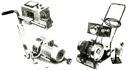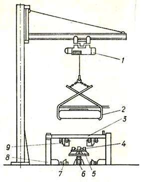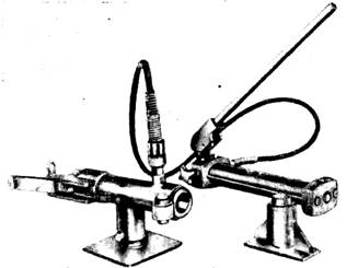 Рисунок 10 – Универсальный механизированный пост для демонтажа и монтажа шин При поступлении колеса на пост колесо захватывают захватным устройством 2, поднимают на высоту 1—1,5 м, транспортируют и при помощи крана-укосины и электротельфера / устанавливают его на стенд демонтажа шин, где диск колеса фиксируется специальными флажками 4 и штифтами, которые входят в отверстие диска колеса. После этого закрывают балку отжимного устройства 3, которая шарнирно установлена на опорах 8 рамы стенда и при установке колес отведена в сторону. Включив электродвигатель, освобождают замочное кольцо колеса путем перемещения силового винта 6 вверх до сдвига бортового кольца диска колеса дугообразными упорами 9 отжимного устройства 3. Затем снимают замочное кольцо и демонтируют покрышку колеса путем перемещения силового винта 6 с колесом вниз и обкатывания при этом борта покрышки катками 7 стенда, которые отжимают борт от закраины обода колеса. Когда шина демонтирована, выключают электродвигатель, отводят в сторону балку отжимного устройства 3, открывают флажки 4 опорного диска 5 и снимают со стенда покрышку и диск колеса с помощью крана-укосины с электротельфером 1 и захватным устройством. Демонтированную покрышку внешне осматривают и производят необходимое ТО. Монтаж шин выполняют на специальной площадке перед стендом демонтажа шин в зоне действия крана-укосины. Накачивают шины сжатым воздухом в специальной предохранительной решетке с применением специального наконечника с манометром к воздухораздаточному шлангу и воздухораздаточной колонке. Применение на АТП рассмотренных постов позволяет снизить трудоемкость шиномонтажных работ в 2,5—3 раза, улучшить условия и культуру производства, исключить производственный травматизм. Одной из наиболее трудных операций при монтаже и демонтаже шины с ободом типа «трилекс» бездисковых колес тяжелых грузовых автомобилей и автобусов особо большой вместимости по праву считается установка и снятие сегментов обода, выполнение которой при помощи ручных монтажных лопаток занимает много времени. Для механизации этой операции применяется приспособление (рисунок 11), представляющее собой гидравлический цилиндр со сменными наконечниками. Этот цилиндр устанавливают внутрь обода колеса и подают в него под высоким давлением жидкость. В зависимости от операции (разборка или сборка) соответствующие наконечники, упираясь с усилием до 6 т в два смежных сегмента, либо освобождают и третий сегмент, либо вводят его в замкнутое состояние. Жидкость в цилиндр может поступать от насоса с электро-, пневмо- или ручным приводом. Демонтированную покрышку осматривают с помощью борторасширителей с различными приводами.