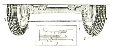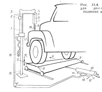 Рисунок 2 – Обнаружение перекоса мостов автомобилей Важной задачей диагностики подвески автомобиля является оценка правильности геометрических размеров и сопряжений, упругих свойств и параметров колебаний подвески. Правильность геометрических размеров и сопряжений (например, высота буфера, люфт в сопряжениях рычагов, амортизаторов, рессор, определяют при помощи линеек, штангенциркулей, шаблонов). Перспективны кратковременно-контактные датчики с регистрацией перемещений на шкале прибора. Упругость подвесок определяют прямым и косвенным методами. При прямом методе снимают упругую характеристику подвески путем измерения ее вертикальных деформаций под действием переменной вертикальной нагрузки и по характеристике определяют коэффициент жесткости и внутреннее трение. Косвенный метод основан на замере условной длины пружины или стрелы прогиба рессоры при нагрузке на ось, указанной в технической характеристике, для автомобиля в снаряженном состоянии. Характеристику упругости снимают при помощи нагружателей и измерителей перемещений. Нагружатель оборудуют устройством для регистрации усилия нагружения. В качестве же измерителей перемещений используют упомянутые уже устройства для определения его геометрических размеров. Параметры колебаний (амплитуды, частоты), свидетельствующие -о техническом состоянии амортизаторов и упругих элементов подвески, можно определить по записям вынужденных колебаний подрессоренных и неподрессоренных масс и свободных колебаний подрессоренных масс автомобиля. Вызывают эти колебания, приподнимая (подтягивая) автомобиль и затем сбрасывая его. Имеются устройства, основанные на методах подтягивания и сбрасывания автомобиля механическим способом с использованием мускульной энергии оператора (применяются для диагностики подвески легковых автомобилей) и без использования специального подъемного приспособления (применяются для диагностики подвески автомобилей любой грузоподъемности). Последнее устройство разработано в Горьковском политехническом институте. Оно позволяет автоматизировать диагностику подвески, сократить потребность в обслуживающем персонале, уменьшить время диагностирования. Принципиальная схема устройства представлена на рисунке 3. Башмак 9 устройства имеет заходную и опорную поверхности. Опорная поверхность составляет с горизонталью 0—0 угол а. К башмаку прикреплены четыре ролика. Они установлены на неподвижных направляющих. С башмаком 9 соединен механизм перемещения с пневмоцилиндром. Передняя и задняя полости пневмоцилиндра 10 посредством трубопроводов 11 и 14 могут быть соединены через клапан управления 13 или с атмосферой, или с воздушной магистралью (трубопровод 12). диагностический автомобиль шина колесо рессора