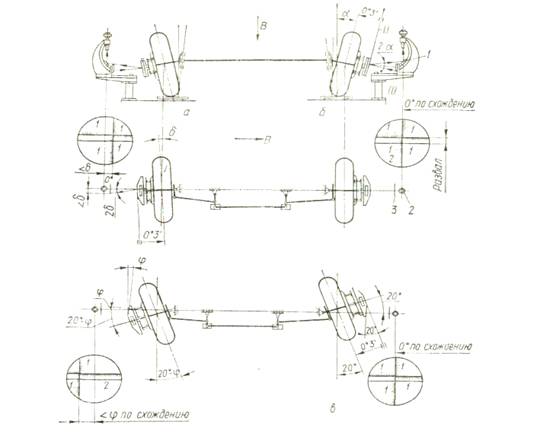 а) определение схождения колес; б) определение развала колес; в) определение соотношения углов поворота колес; I – плоскость вращения колеса; II – плоскость зеркала колеса; III – плоскость шкалы; 1, 2, 3 – зеркало, окуляр и шкала микроскопа соответственно. Рисунок 5 – Проверка углов установки колес автомобиля при помощи оптического стенда У автомобилей с неразрезной передней осью углы развала колес и наклона шкворней не регулируются. У автомобилей с независимой подвеской углы развала регулируют поворотом эксцентриковых втулок. Максимальные углы поворота передних колес регулируют ограничительными болтами, которые ввернуты в поворотные рычаги и упираются при зависимой подвеске в кулаки переднего моста, а при независимой — в выступы стоек подвески. Схождение передних колес автомобиля диагностируют с помощью специальных линеек. При замере схождения линейку устанавливают спереди колес так, как показано на рисунке 6. Затем автомобиль перекатывают вперед до тех пор, пока линейка не займет симметричное положение за передней осью. Перемещение стрелки укажет на величину схождения колес. При проверке схождения колес автомобиль должен быть ненагружен, а положение колес должно соответствовать движению по прямой. На автомобилях с неразрезной поперечной тягой схождение колес регулируют изменением длины поперечной тяги, а с разрезной осью (при независимой передней подвеске) — изменением длины боковых рулевых тяг.