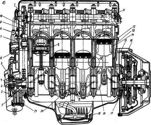 Будову автомобіля “ЗІЛ-130” добре видно на рисунку 1,2 в повздовжньому та поперечному вигляді. Рисунок 1- Повздовжній розріз двигуна 1-ведуча шестерня приводу газорозподілу; 2-шків колінчастого вала; 3, 17 –самопіджемні манжети (сальники); 4-храповик; 5-масляний фільтр; 6-зірочка натяжного пристрою; 7,8 - відповідно нижня і верхня кришки розподільних зірочок; 9 -ланцюг приводу механізму газораспределения; 10 -ведена шестерня механізму газоросподілу; 11- розподільний вал; 12 головка циліндрів; 13- гільза циліндра; 14 - блок циліндрів; 15 -картер зчеплення; 16- маховик; 18 - колінчастий вал; 19 - масло приймач; 20- упорна шайба; 21-масляний насос;