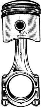 Рисунок –10 Взаємне положення поршня і шатуна Перед установкою в гільзу поршня з кільцями і шатуном у зборі змазати олією для двигуна поршневі кільця, юбку поршня і поршневий палець; розгорнути поршневі кільця в канавках, поршня так, щоб замки сусідніх кілець стояли друг від друга на 120° (рис. 9); перед тим як вставити поршень з кільцями в гільзу циліндра, зжати кільця спеціальним обтиском і простежити, щоб вони не змістилися і не порушилося взаємне розташування замків; повернути колінчатий вал так, щоб шатунна шийка установилася в н.м.т.; перевірити, чи правильно установлені вкладиші в шатуні й у його кришці, змазати маслом для двигуна; перед установкою гільзи з поршнем у зборі і із шатуном у блок циліндрів нижньої опорний торець, що центрує бурт на довжині 15 мм від торця, і прокладка гільзи повинні бути змазані маслостійкою нітрофарбою; вставити гільзу циліндра в розточення блоку циліндрів, проштовхнути поршень у глиб гільзи і зібрати латунний підшипник на шийку колінчатого вала. При установці гільзи в блок циліндрів звернути увагу на те, щоб стрілка, вибита на днище поршня, виступи на тілі шатуна і на кришці були звернені убік ланцюгової передачі привода газорозподілу, а осі поршневих пальців зміщені в праву сторону двигуна. (рис. 10). Гайки шатунних болтів затягувати рівномірно. Остаточне затягування гайок робити динамометричним ключем (момент затягування 5,0-6,5 кгс-м). Перевірити, чи легко провертається колінчатий вал у підшипниках, попередньо зміцнивши гільзи від подовжнього зсуву спеціальними затисками. повернутий болт шатуна, що повернувся, може своєю головкою зашкодити дзеркало циліндра. Зняття й установка поршневих кілець. Поршневі кільця (рис. 11) варто знімати і надягати на поршень тільки за допомогою спеціального знімача (рис. 12). Виступи 2 знімачі входять у зазор замка поршневого кільця і при натисканні на рукоятки 1 розводять кільце. Розтискаючи, кільце упирається робочою поверхнею в упори 3 захоплень 4і тому залишається круглим. Розціплене кільце легке знімається і легко встановлюється в канавку поршня. Розбирання і збирання поршня із шатуном. Розбирання поршня із шатуном роблять у наступній послідовності: вийняти стопорні кільця, що утримують поршневий палець у бобишках, піддягаючи кожне з них тонкою викруткою; нагріти порщень, занурюючи його на 2—3 хв у судину з водою, температура якої близько 4-550С; випресовати поршневий палець з поршня і втулки голівки шатуна ударом молотка через латунне відправлення. Шатун з поршнем збирають у зворотній послідовності. При цьому необхідно звернути увага на наступне: у випадку заміни одного із шатунів він повинний бути підібраний по масі і розміру отвору під поршневий палець; різниця в масі найважчого і найлегшого шатуна в комплекті, установлюваному на двигун, не повинна перевищувати 8 гр. Приналежність шатуна до визначеної групи (по масі) маркірують чи фарбою на приливі його кришки; зазор між поршневим пальцем і втулкою голівки шатуна, що належать однієї і тій же розмірній групі .(має однакове кольорове маркірування), перевіряють на ощуп. Поршневий палець повинен щільно входити в отвір втулки під тиском великого пальця. У межах даної розмірної групи деталей посадка поршневого пальця у втулці голівки шатуна здійснюється з зазором 0,0045-0,0095 мм; перевірку стану поршнів і шатуни і за