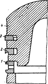 Рисунок - 11. Розташування поршневих кілець у канавках поршня: 1—маслоз’ємне кільце; 2-нижнє компресійне кільце; 3-верхнє компресійне кільце; 4-поршень.