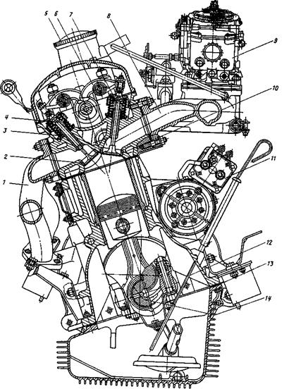 Рисунок 2- Поперечний розріз двигуна 1- колектор; 2- сідло випускного клапана; 3- пружина клапана велика; 4- клапан випускний; 5- пробка маслозаливного отвору; 6- коромисло клапана; 7- клапан впускний; 8- труба впускна; 9- карбюратор; 10- сідло впускного клапана; 11- стартер; 12- щуп масляного картера; 13- прокладки масляного картера; 14- вкладиш підшипника шатуна. . Під час першого такту (впускання) поршень переміщується від ВМТ до НМТ, впускний клапан відкритий, а випускний — закритий. У циліндрі створюється знижений тиск (0,08...0,09 МПа), а температура підвищується до 90...125 °С. На другому такті (стискання) поршень переміщується від НМТ до ВМТ, впускний і випускний клапани закритий. В циліндрі створюється підвищений тиск (1,0... 1,2 МПа — в карбюраторних двигунах і 1,5...2,0 МПа — в дизелях), а температура наприкінці цього такту досягає 350...450 °С у перших і 600...700 °С в других. На третьому такті (робочий хід) поршень переміщується від ВМТ до НМТ, клапани закриті. В карбюраторному двигуні відбувається займання робочої суміші від іскри на свічці. При цьому тиск газів досягає 3,5...4,0 МПа, а температура — 2000 °С. Під дією такого тиску поршень переміщується від ВМТ до НМТ. На четвертому такті (випускання) поршень переміщується від НМТ до ВМТ, випускний клапан відкритий. Тиск знижується до 0,1 МПа. Після закінчення четвертого такту розпочинається новий цикл, і корисна механічна робота здійснюється двигуном тільки протягом одного такту — робочого ходу. Решта три такти — випускання, впускання, стискання — є підготовчими і здійснюються завдяки кінематичній енергії маховика, що обертається за інерцією у проміжках часу між робочими ходами. Якщо двигуни мають кілька циліндрів, які працюють у певному порядку, то підготовчі такти в одних циліндрах здійснюються завдяки енергії, що розвивається в інших циліндрах. 2. Технічне обслуговування Таблиця 1. Контрольні, регулювальні і профілактичні роботи, виконані при технічному обслуговуванні