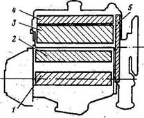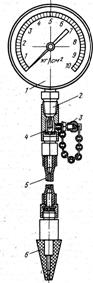 Рисунок 3-Компресометр: манометр; 2- штуцер; 3 -ковпачкова гайка; 4-зворотний клапан; 5-гумовий шланг; 6- гумовий наконечник Для отримання правильного свідчення компресометра колінчастий вал двигуна повинен обертатися з частотою 180- 200 об/хв. або вище, але не більше за 350 об/хв. Акумуляторна батарея повинна бути повністю заряджена. Допускається тимчасове підвищення напруги на зажимах стартера при підключенні відсутнього джерела струму. Записавши величину максимального тиску газів в циліндрі, випускають повітря з компресометра, відвернувши на один-два обороти ковпачкову гайку 3. Після повернення стрілки в нульове положення знову загортають гайку. Таким же чином перевіряють компресію в інших циліндрах. Тиск повинен бути не нижчим за 10 кгс/см2 і не повинен відрізнятися в різних циліндрах більш ніж на 1 кгс/см2. Знижена компресія в окремих циліндрах може виникнути внаслідок нещільної посадки клапанів в сідлах, пошкодження прокладки головки циліндрів, поломки або пригорання поршневих кілець. Знижена компресія у всіх циліндрах вказує на знос поршневих кілець. Для виявлення причин недостатньої компресії в циліндр із зниженою компресією заливають. 20-25 см3 масла для двигуна і знову заміряють компресію. Якщо величина компресії залишається без змін, то це вказує на нещільну прилягаючу клапанів до їх сідел або на пошкодження прокладки головки циліндрів. Зростання величини компресії свідчить про несправність поршневих кілець. Причина недостатньої компресії може бути виявлена також подачею стислого повітря в циліндр, в якому поршень заздалегідь ставлять у в.м..т. такту стиснення. Для цього, знявши з компресометра гумовий конічний наконечник і приєднавши до нього шланг компресора, вставляють наконечник в отвір для свічки запалювання і подають в нього повітря під тиском 2 -3 кгс/см2. Для запобігання провертанню колінчастого вала двигуна включають вищу передачу в коробці передач і загальмовують автомобіль ручним гальмом. Вихід (витік) повітря через карбюратор свідчить про нещільність прилягаючого впускного клапана, а через глушитель про нещільність прилягаючого випускного клапана. При пошкодженні прокладки головки циліндра пухирці повітря будуть виходити через горловину радіатора або в сусідній циліндр, що виявляють по характерному шипіння 3.4 Перевірка стану двигуна по шумах і стукотах По шуму роботи при відомій навичці можна судити про технічний стан двигуна. На слух можуть бути виявлені збільшені зазори в сполученнях деталей, випадкові поломки і ослаблення кріпильних деталей окремих вузлів. Збільшені зазори в шатуні і корінних підшипниках колінчастого і розподільного валів, між поршнями і циліндрами, клапанами і регулювальними болтами коромисел, а також довгастий ланцюг приводу газорозподілу викликають свій специфічний стукіт. І якщо порівняно неважко виявити підвищену шумність або який-небудь стукіт в двигуні, то визначити місце стукоту і конкретне сполучення пошкоджених деталей вдається лише досвідченій механіці, що має необхідні навички в розпізнаванні таких дефектів. Для прослуховування шумів і стукотів в двигуні користуються стетоскопом. Найбільш характерні зони прослуховування показані на рис. 4. Прослуховування двигуна починають відразу ж після його пуску в процесі прогрівання на неодруженому ходу. Декілька під