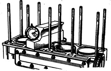 Рисунок-8. Визначення величини виступу верхнього торця гільзи циліндра над верхньою плоскістю блоку циліндрів Величина виступу повинна бути в межах 0,025—0,120 мм, але за умови, що для одного двигуна різниця у величині виступання гільз між собою не повинна бути більше 0,07 мм. Перевірку проводять, попередньо пригорнувши гільзу до блоку циліндрів із зусиллям Р=5...7 кгс (при визначенні величини виступу за допомогою пристосування потрібне зусилля забезпечується його масою, рис. 8). При необхідності підбирають прокладки потрібної товщини;